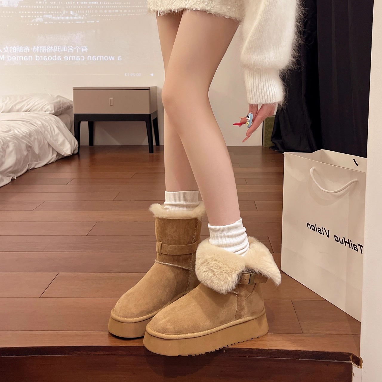 大码女靴41到43胖脚宽肥厚底皮毛一体高筒雪地靴女加绒保暖短棉靴