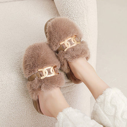 秋冬季坡跟毛绒棉拖鞋女法式优雅厚底防滑保暖时尚甜美居家鞋外穿