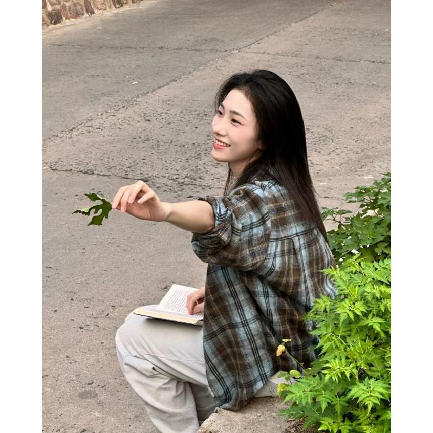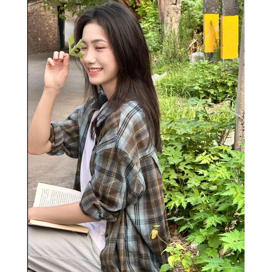 美式覆古格子长袖衬衫女春秋宽松设计感法式别致防晒开衫衬衣外套