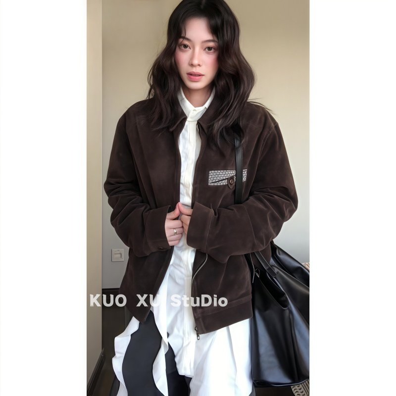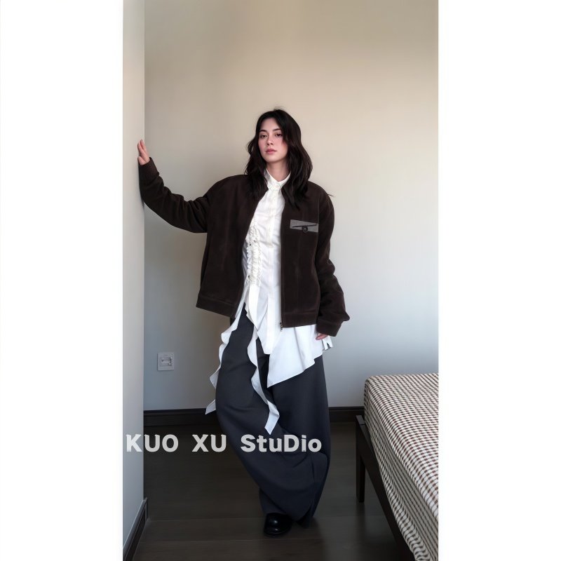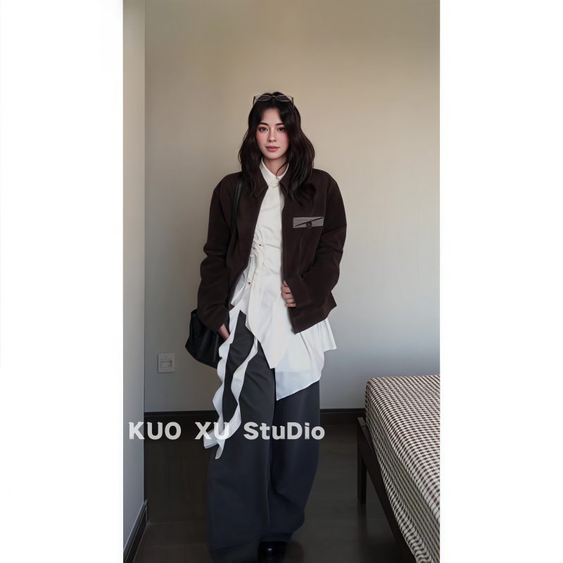 秋冬穿搭法式复古正肩夹克外套荷叶边衬衫收腰显瘦阔腿裤子套装女