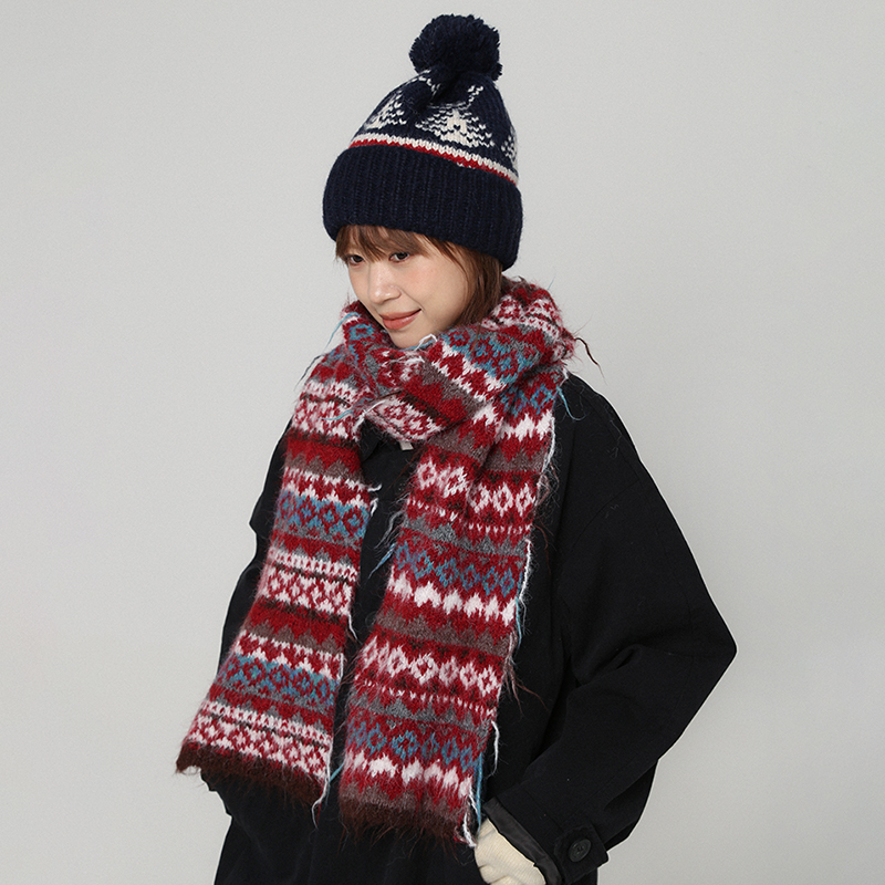 费尔岛风新款针织流苏围巾女冬季韩系氛围感复古加厚保暖毛线围脖