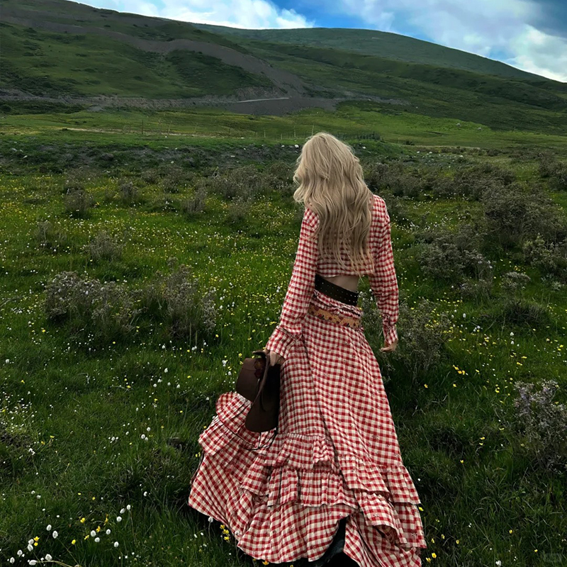法式复古红色格子穿搭套装长袖衬衫+高腰开叉半身裙大摆拖尾裙摆