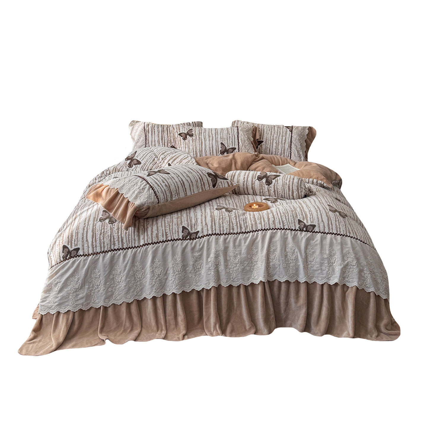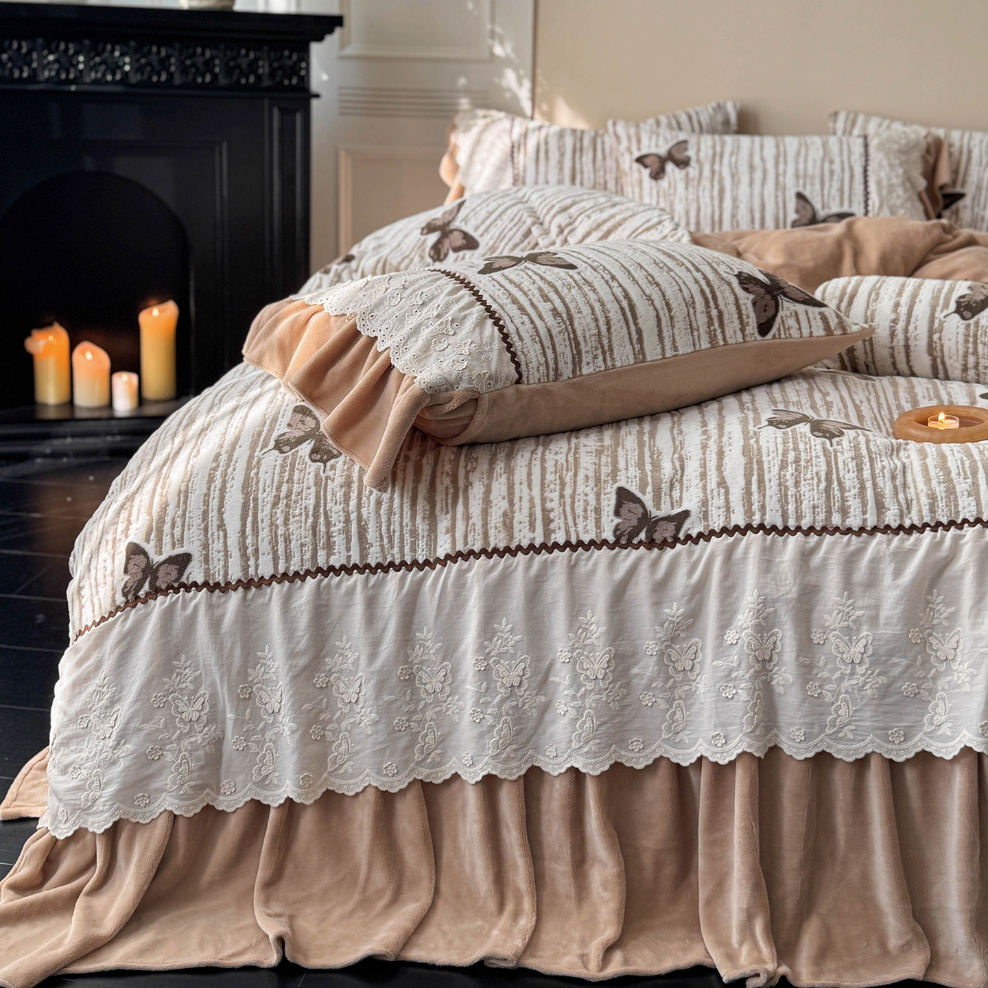 法式浪漫牛奶绒四件套公主风珊瑚绒双面绒蝴蝶蕾丝少女心加绒床单