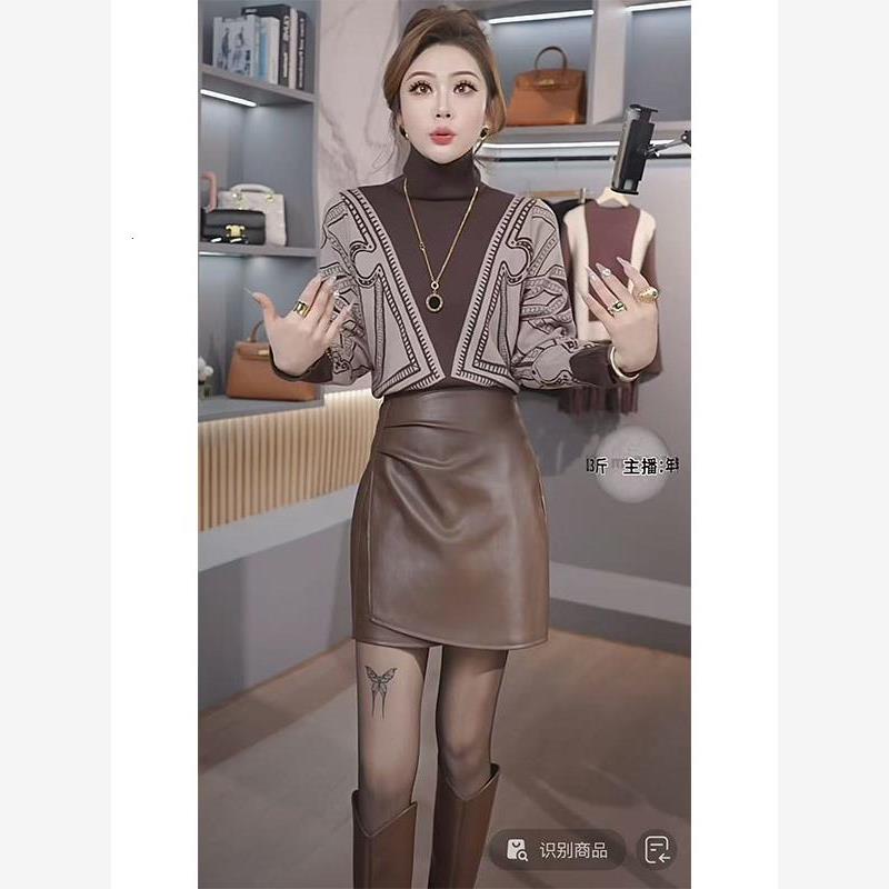高级感女装撞色拼接毛衣短款皮裙显瘦套装时尚大学生女高级感轻奢