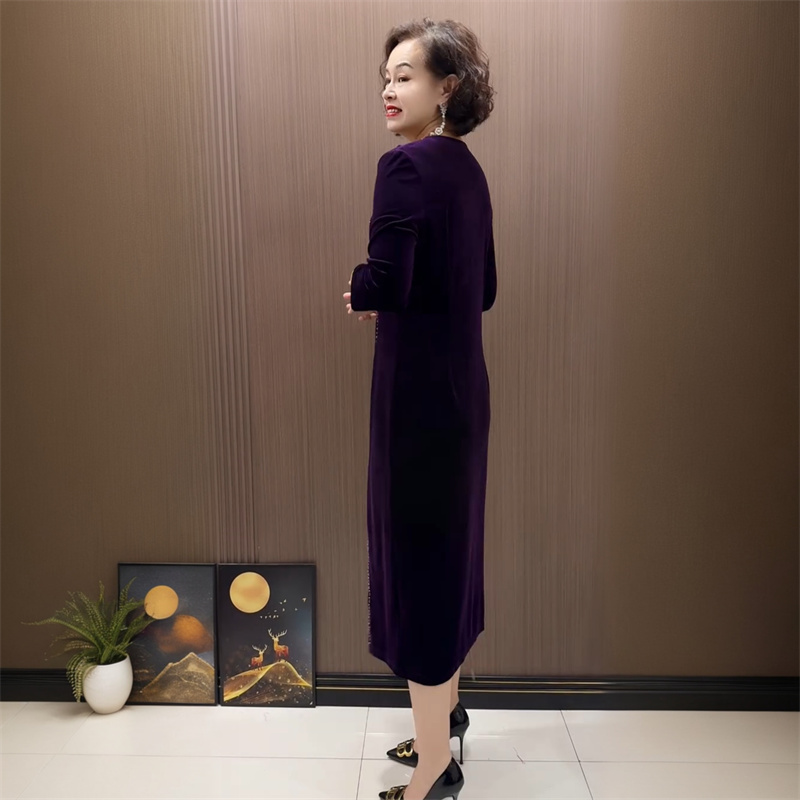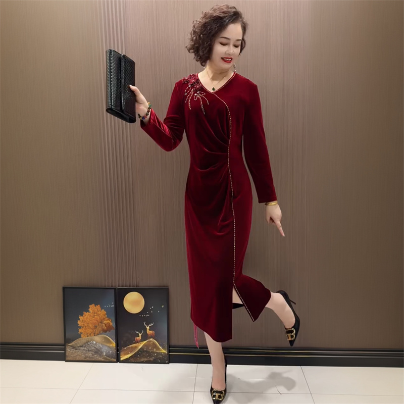 春装新款丝绒镶钻喜婆婆妈妈婚宴装连衣裙收腰显瘦遮肉洋气旗袍裙