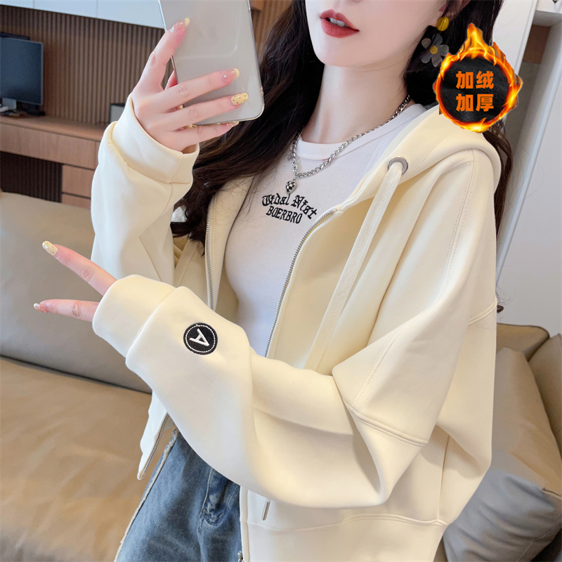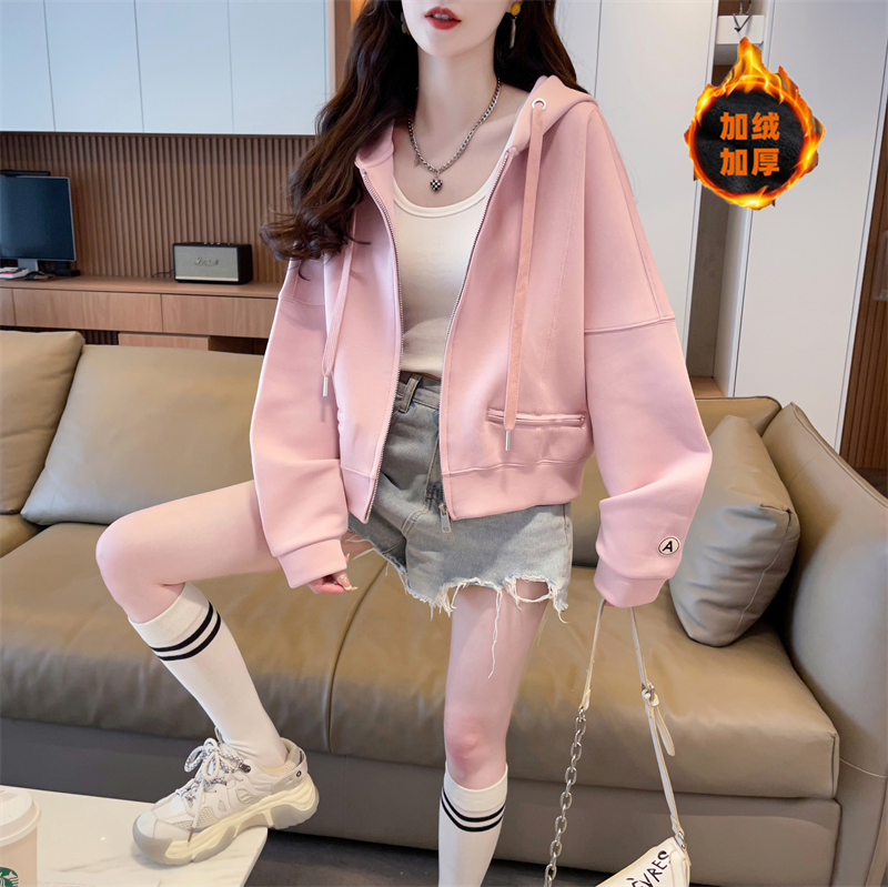 小个子短款连帽粉色外套女秋冬韩版宽松大码加绒加厚休闲开衫卫衣
