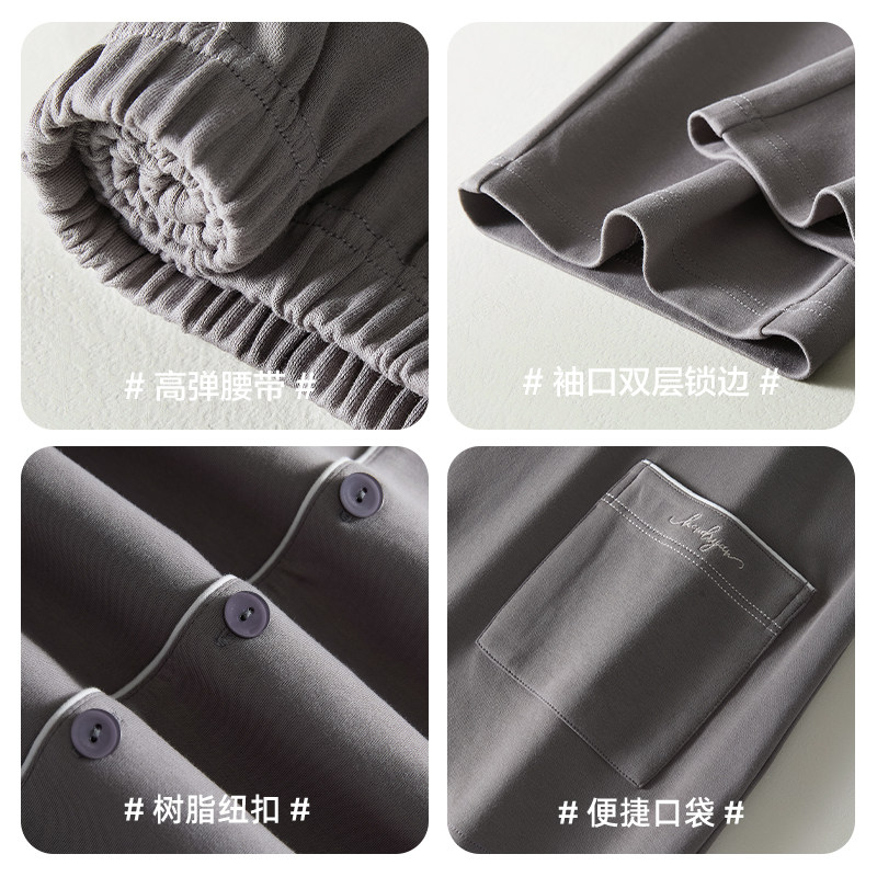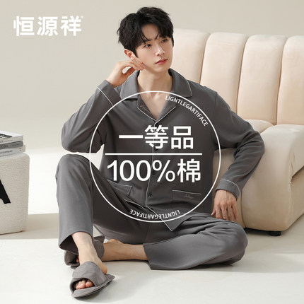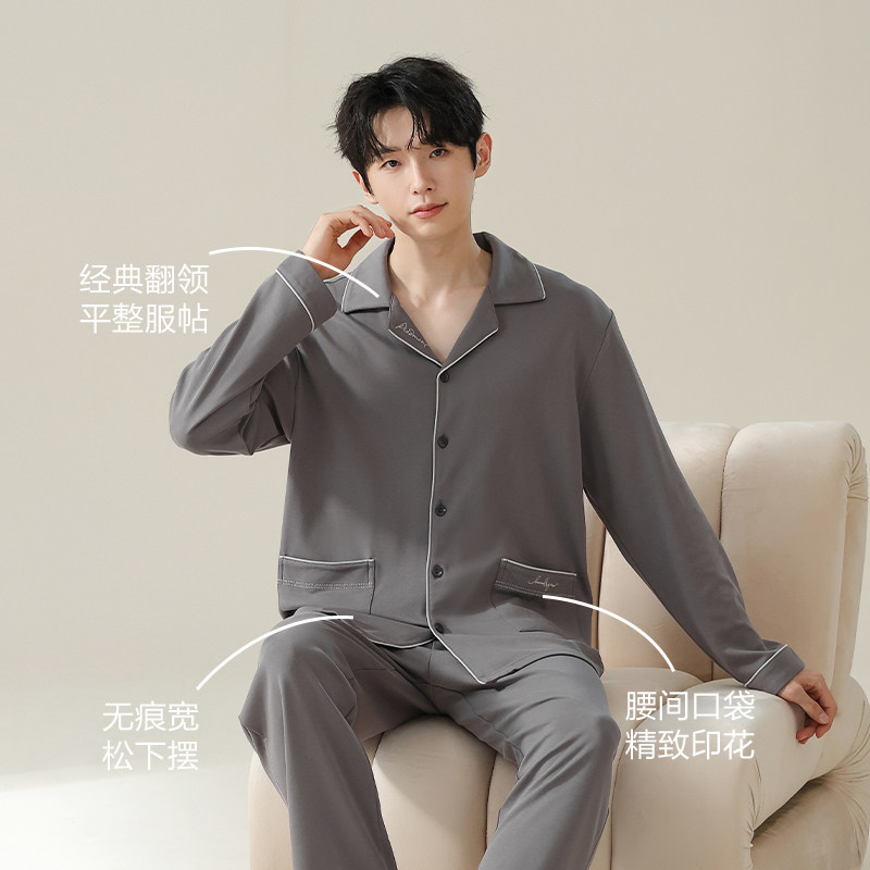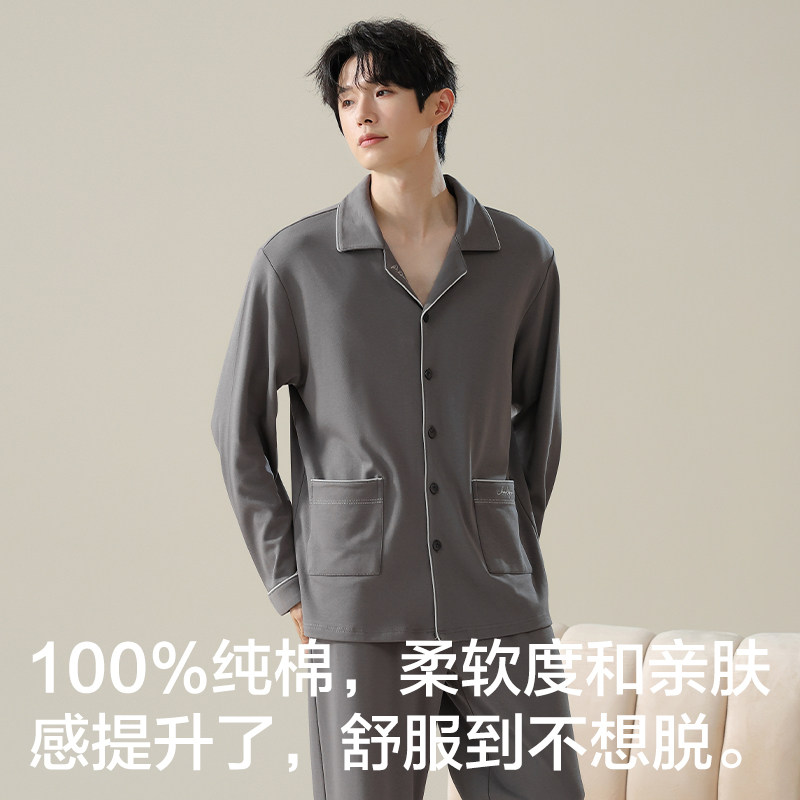 恒源祥睡衣男秋冬纯色开衫翻领家居服套装休闲家居可外穿长袖睡衣