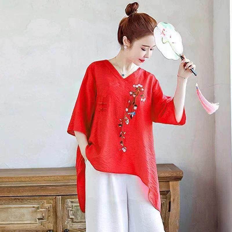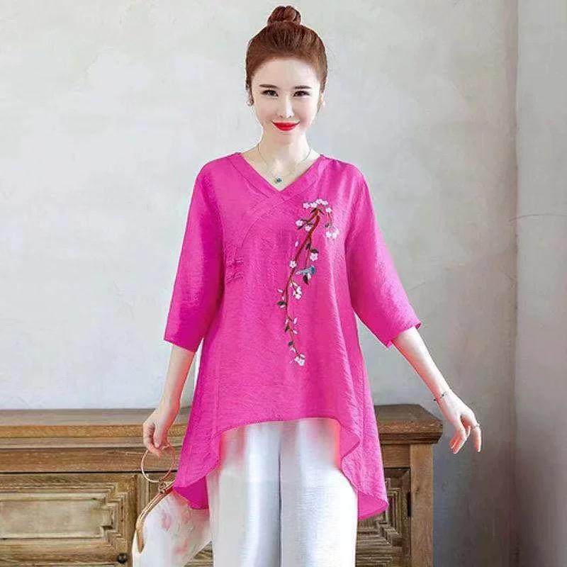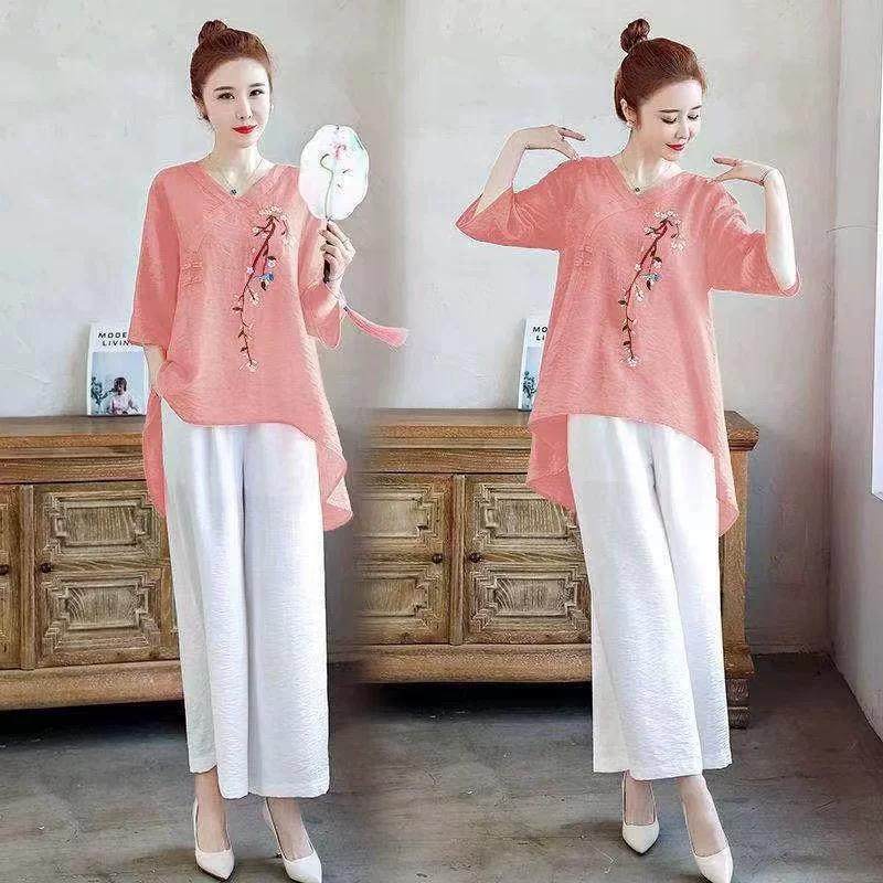民族风刺绣棉衬衫上衣女2025夏季新款新中式衬衣宽松阔腿裤套装