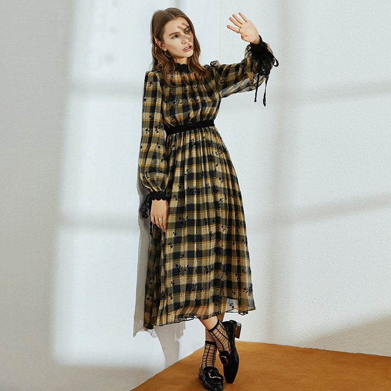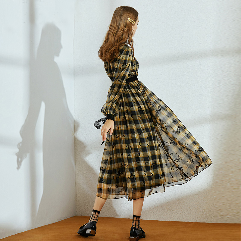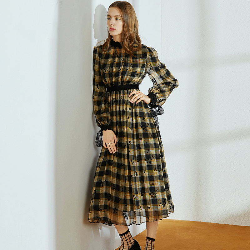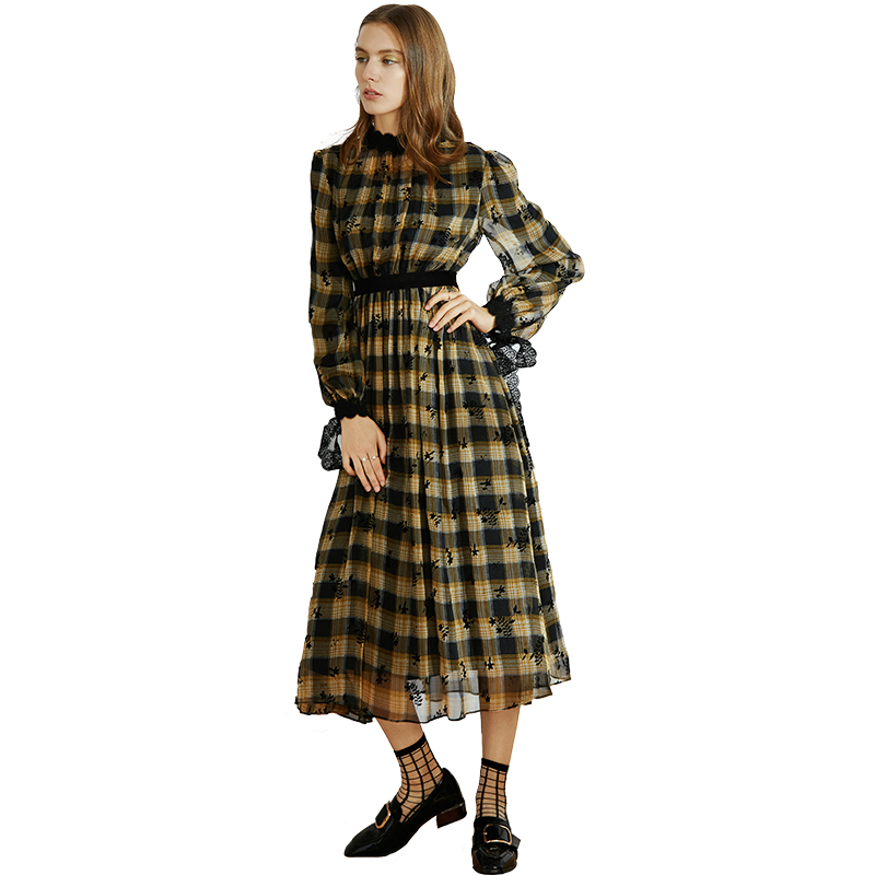 蕾丝拼接格子连衣裙女性感两件套秋冬新品复古风显瘦a字高腰长裙
