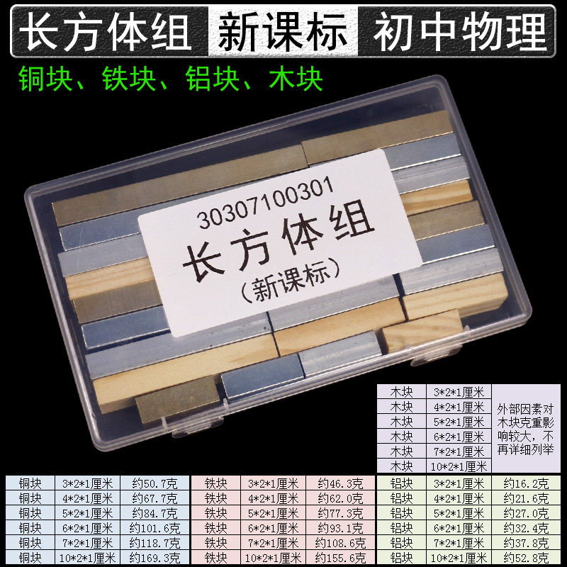 长方体组初中物理铁块铝块塑料块木块铜块新课标同体积不同重量测定物质密度比较力学实验器材教学仪器教具