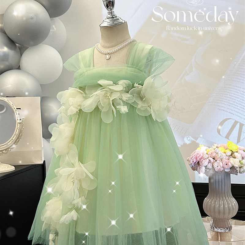 女童连衣裙夏季2024新款洋气小女孩绿色生日礼服宝宝表演蓬蓬纱裙