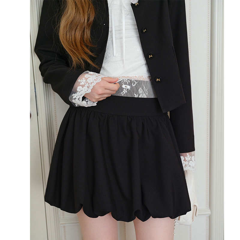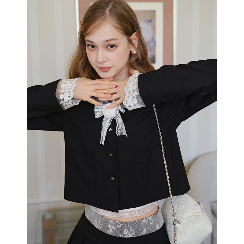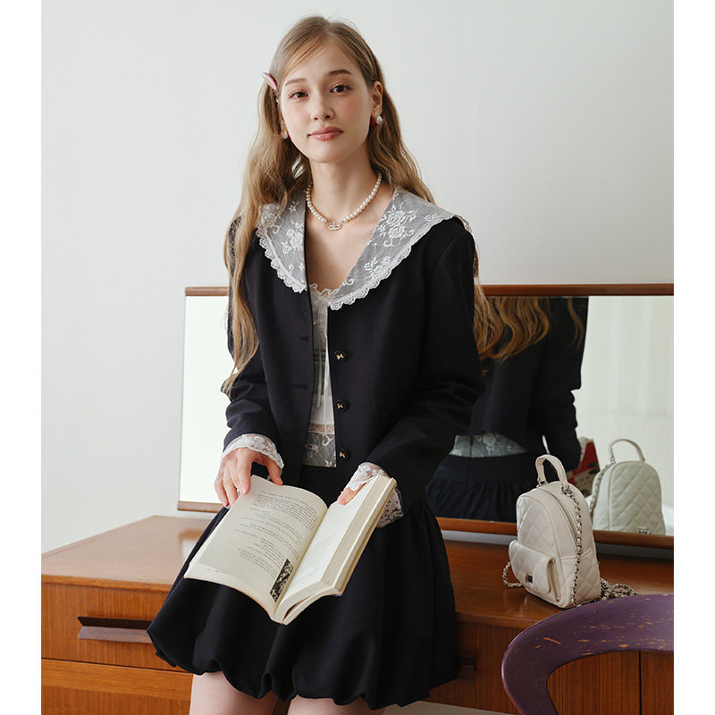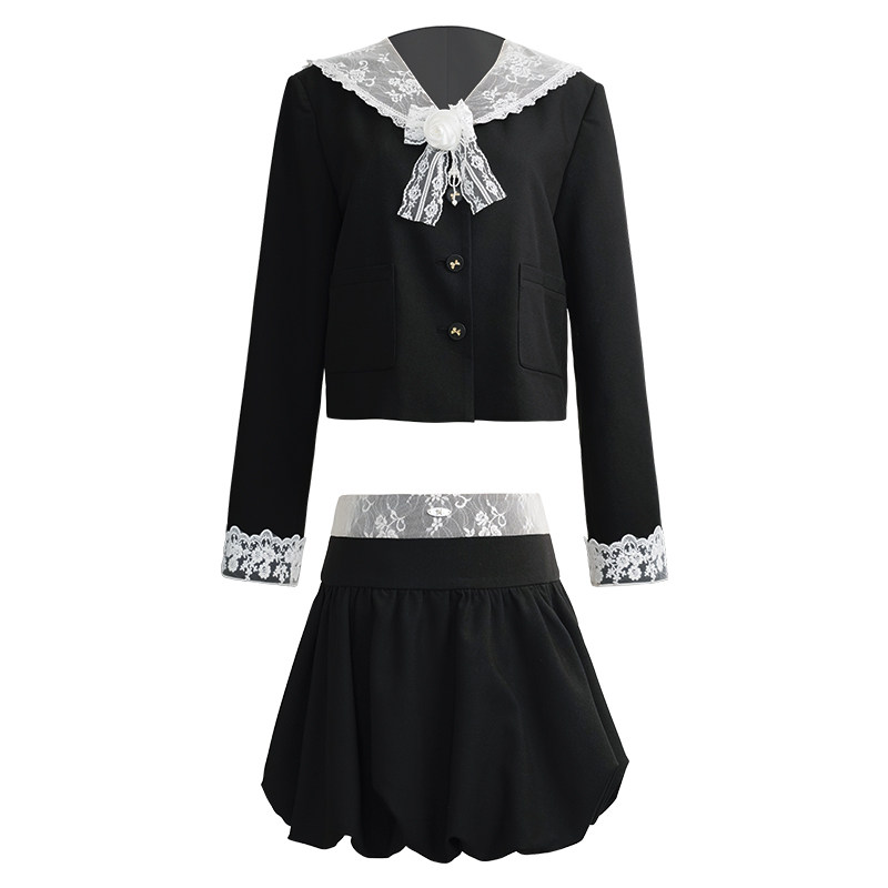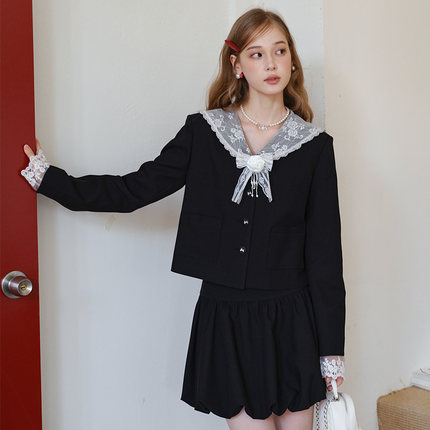 2026学院风黑色套装裙蕾丝海军领外套短款云朵花苞半身裙春秋女装