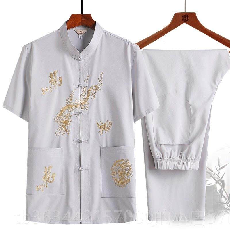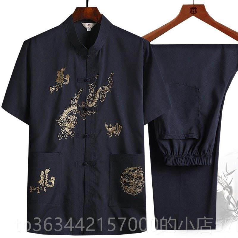 高档中老年人夏汉衬季套装唐装男短袖衫刺绣爸爸大码晨练服爷爷服