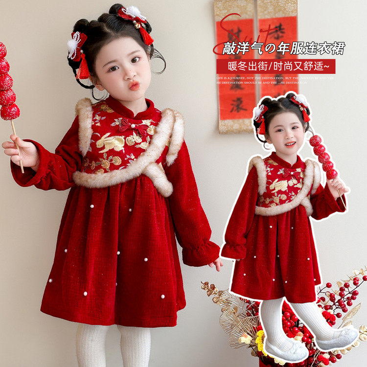 女童秋冬装加绒加厚连衣裙玉兔拜年服公主裙女宝宝唐装中国风裙子