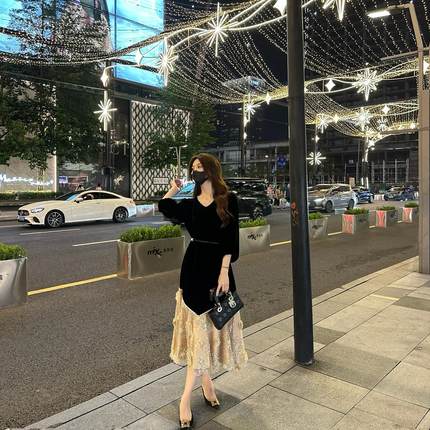 法式重工艺刺绣珠片丝绒拼接蕾丝连衣裙女2025秋时髦气质显瘦长裙