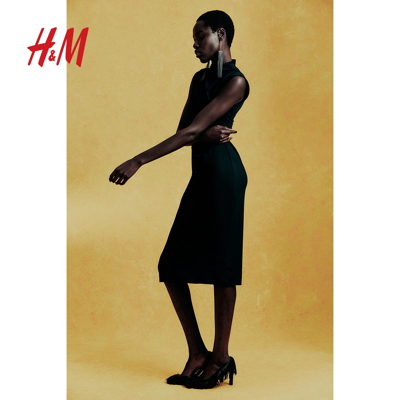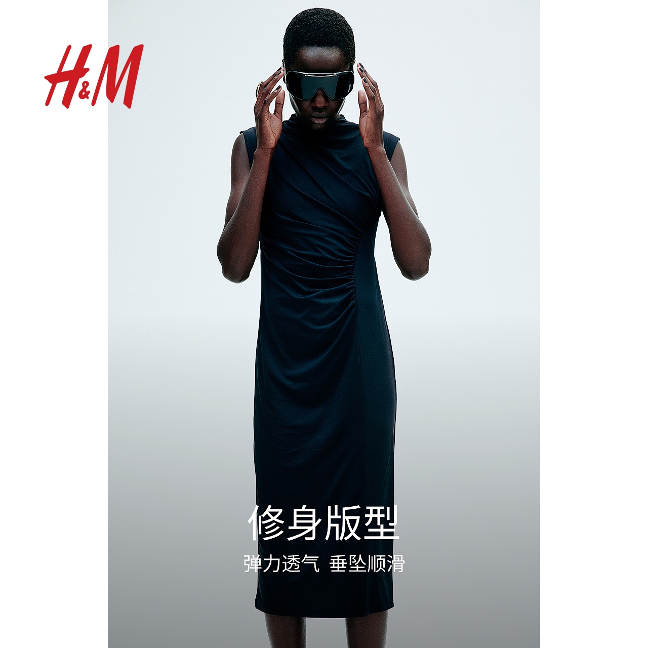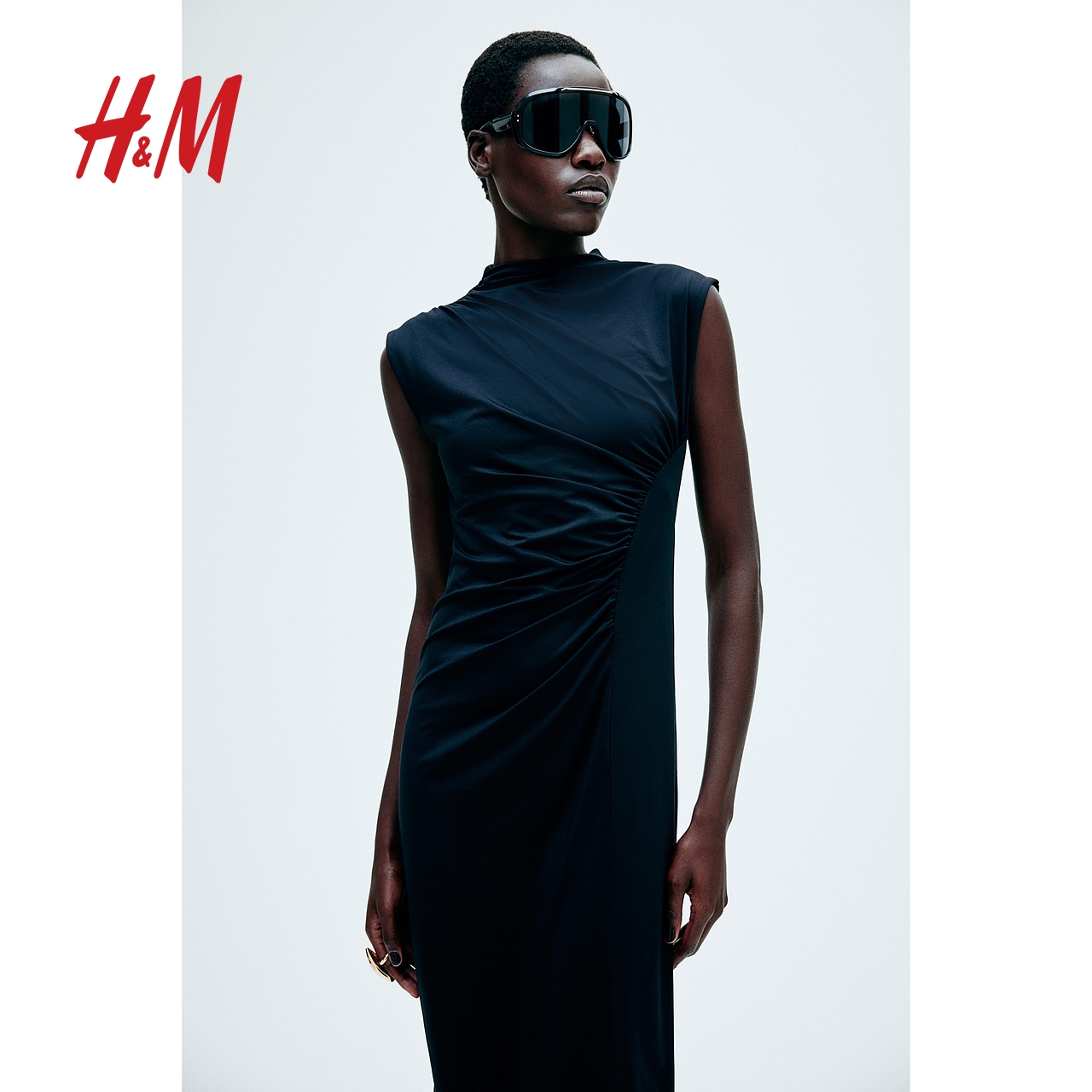 HM女装连衣裙2025秋季新款圆领无袖修身显瘦垂褶高领长裙1265321