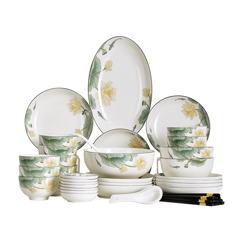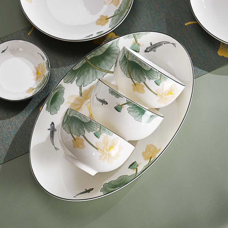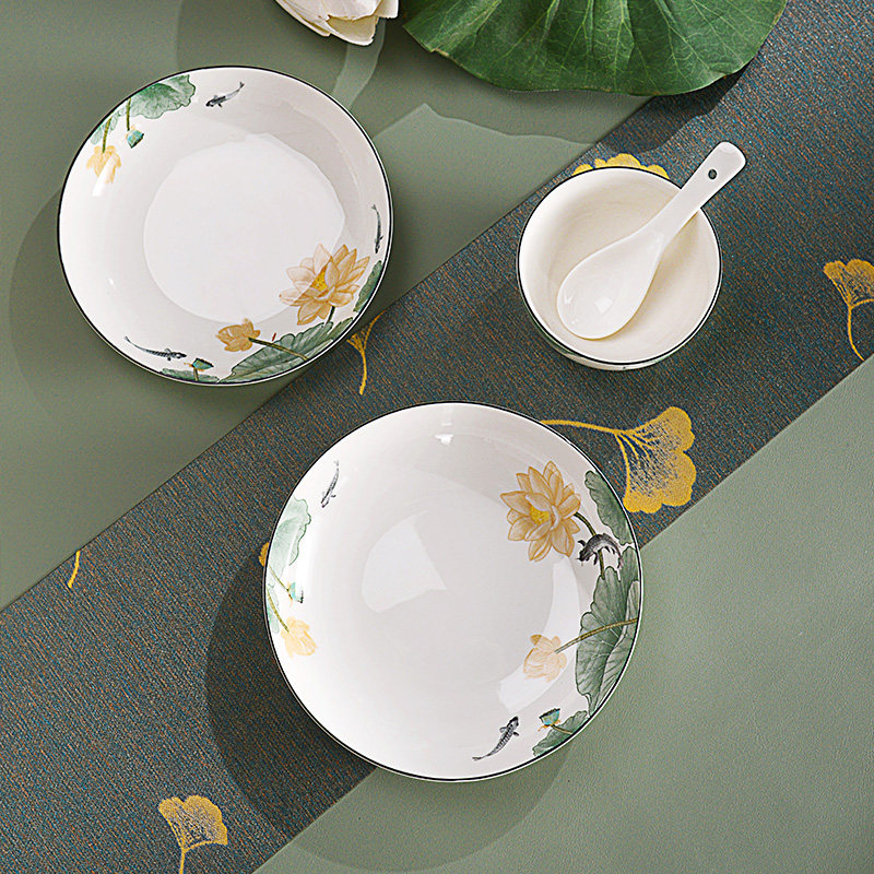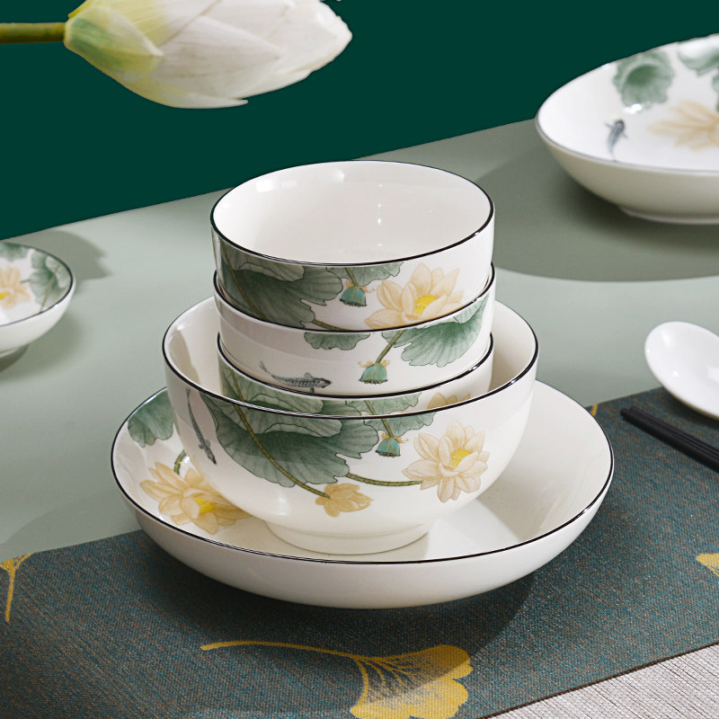 餐具碗碟筷盘子 轻奢简约中国风家用釉中彩微波炉适用 莲年有鱼