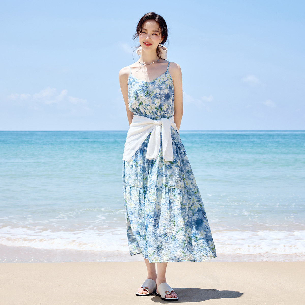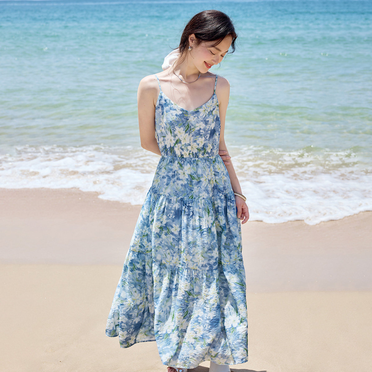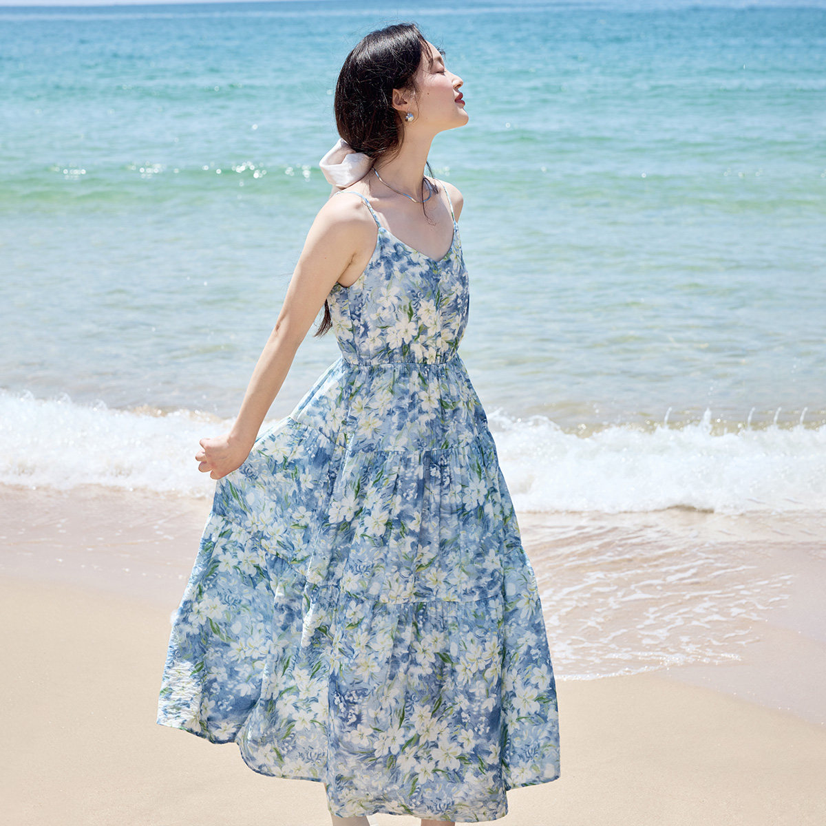 茵曼法式浪漫无袖吊带连衣裙2025夏季高级感海边度假A字碎花裙子