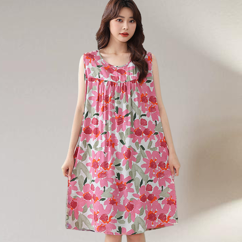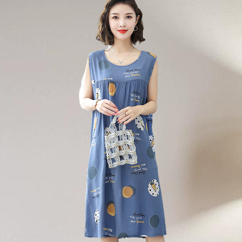绵绸睡裙女士夏季宽松大码无袖背心裙子人造棉家居服妈妈棉绸睡衣