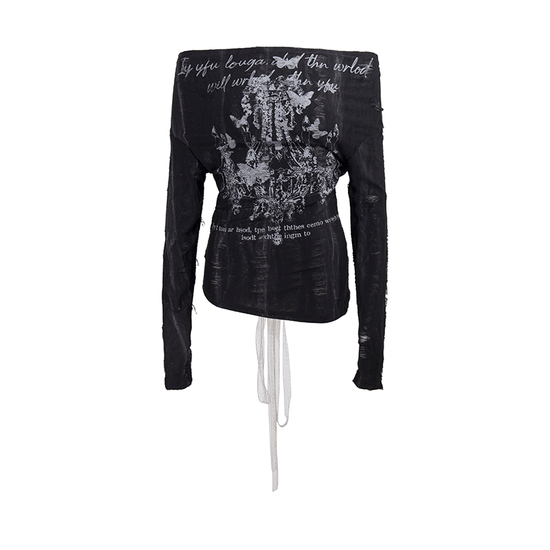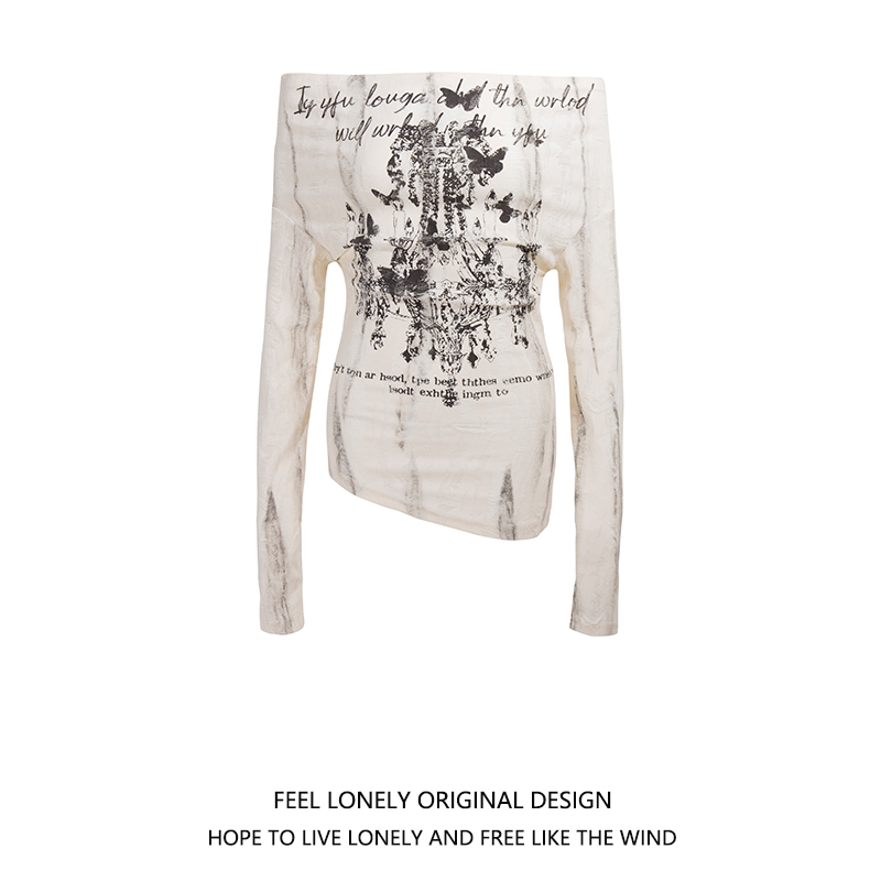 Feel lonely 暗黑朋克印花一字肩长袖T恤绑带y2k秋季辣妹显瘦上衣