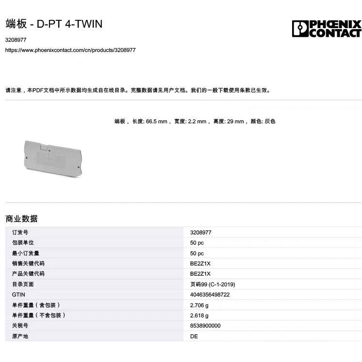 原装菲尼克斯接线端子端板D-PT4-TWIN 端子挡板订货号3208977