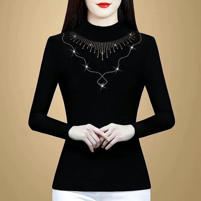 烫钻长袖T恤秋冬新款加绒加厚内搭打底衫妈妈减龄上衣蕾丝打底衫