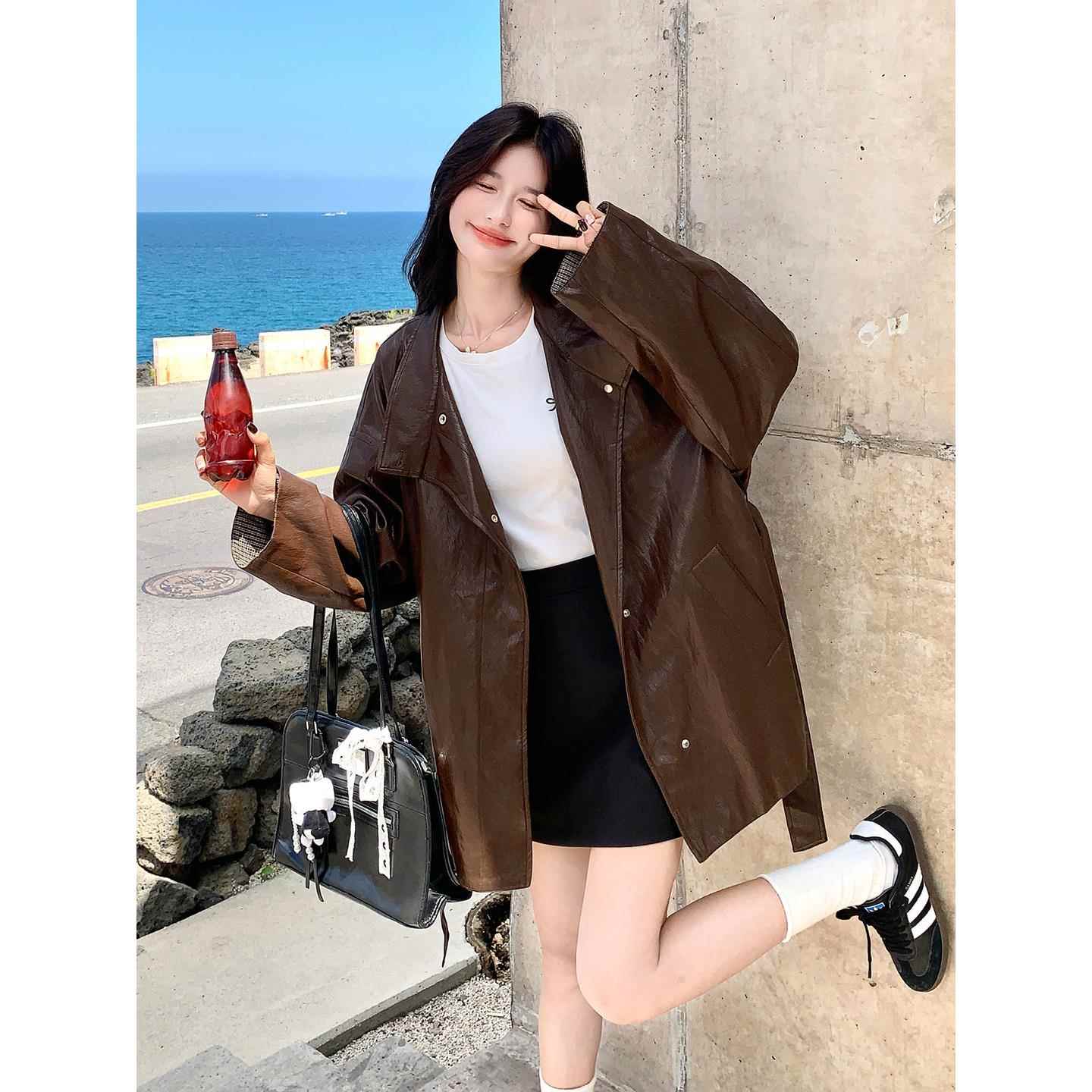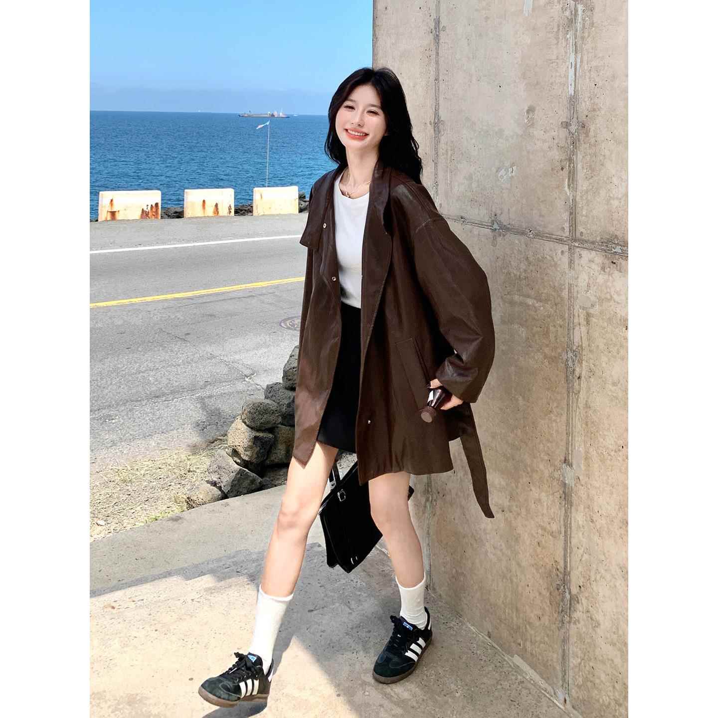 格子拼接袖口PU皮衣风衣外套秋冬季大码女装中长款外套收腰大衣潮