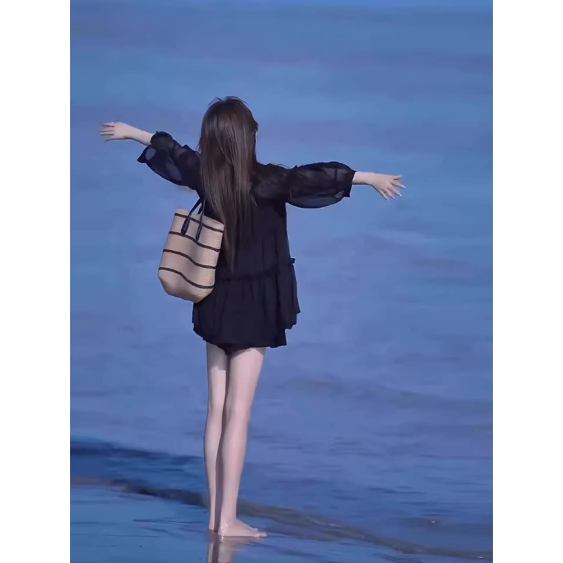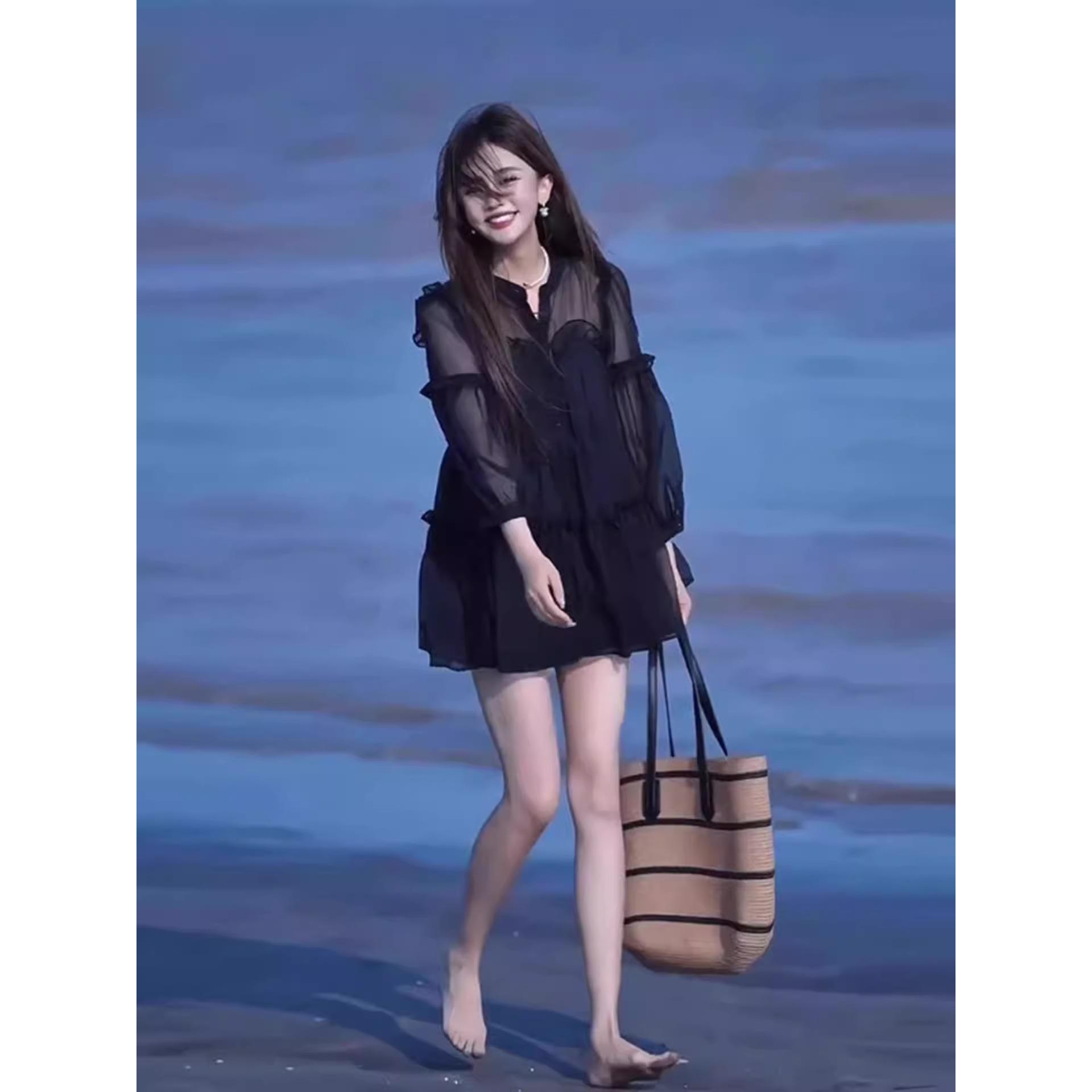 夏季穿搭一整套大码胖mm黑色雪纺上衣阔腿短裤高级绝美好看套装女