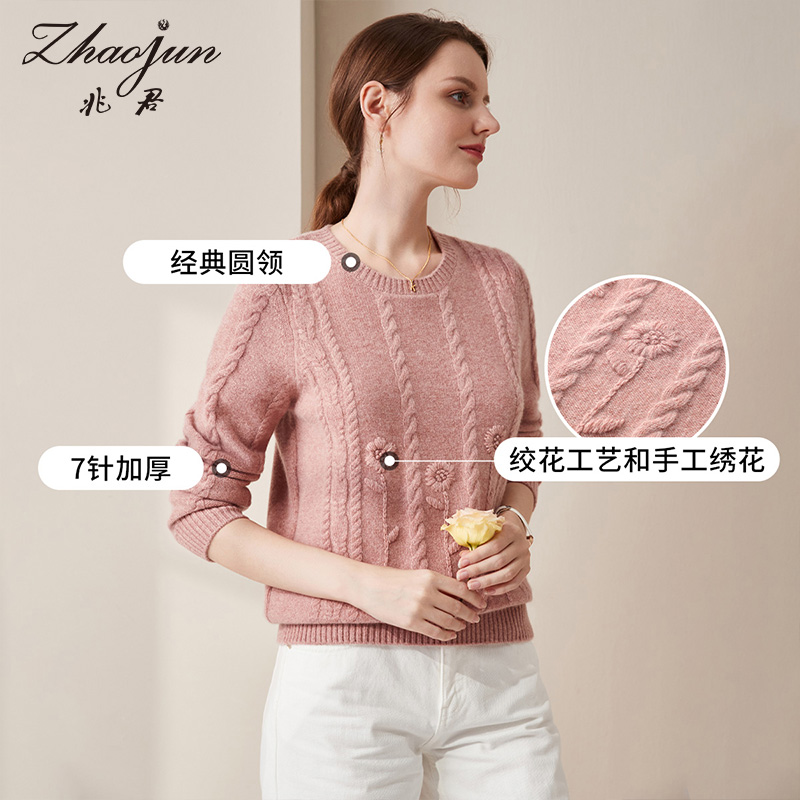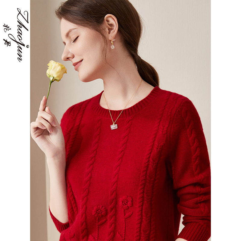 兆君秋冬绣花圆领红色羊绒衫女 加厚绞花套头毛衣打底针织衫