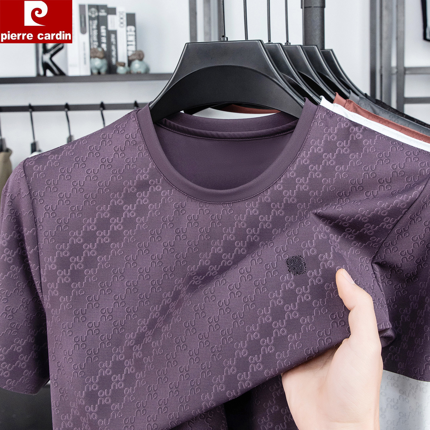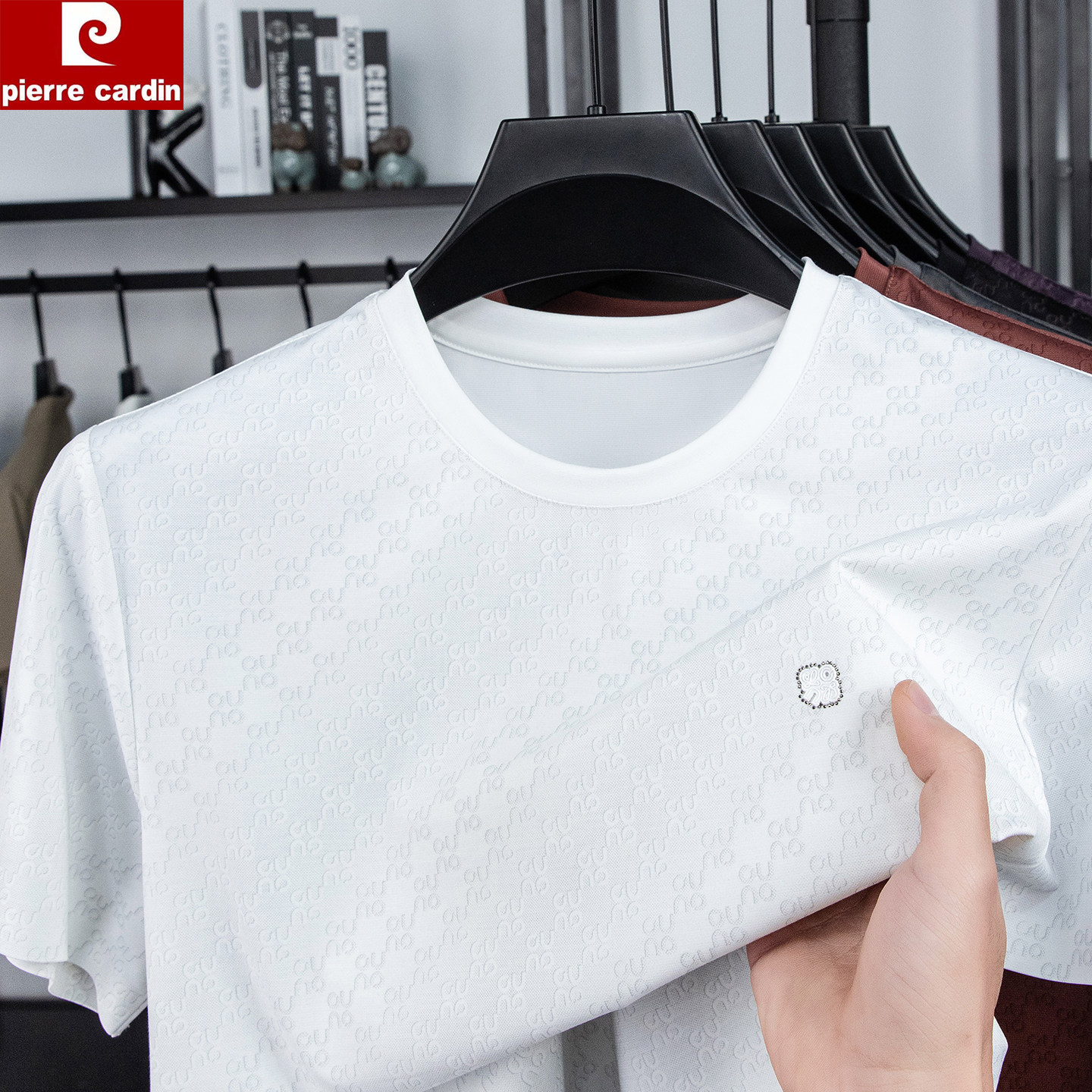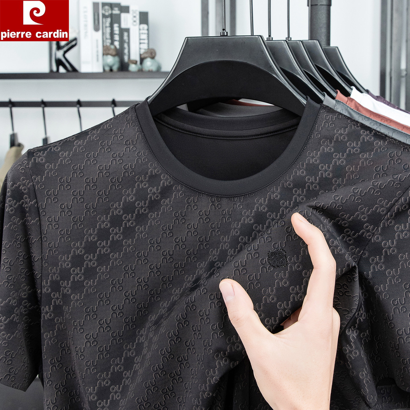 皮尔卡丹正品男士桑蚕丝短袖T恤圆领简约百搭印花半袖冰丝体恤衫