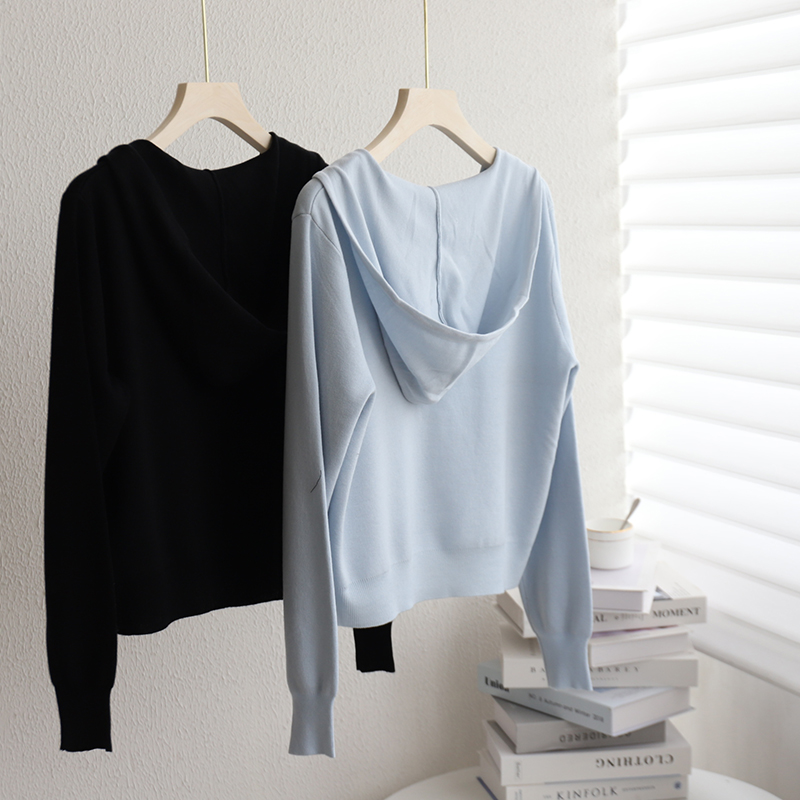 针织衫女带帽假两件套头条纹初秋穿搭新款外衣天丝开衫短外套上衣