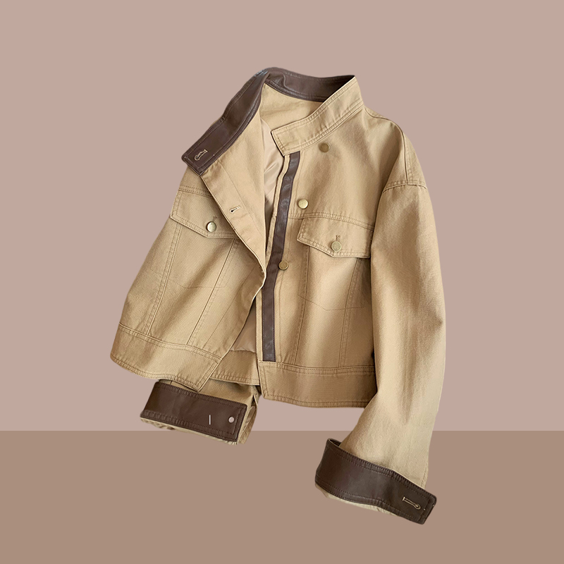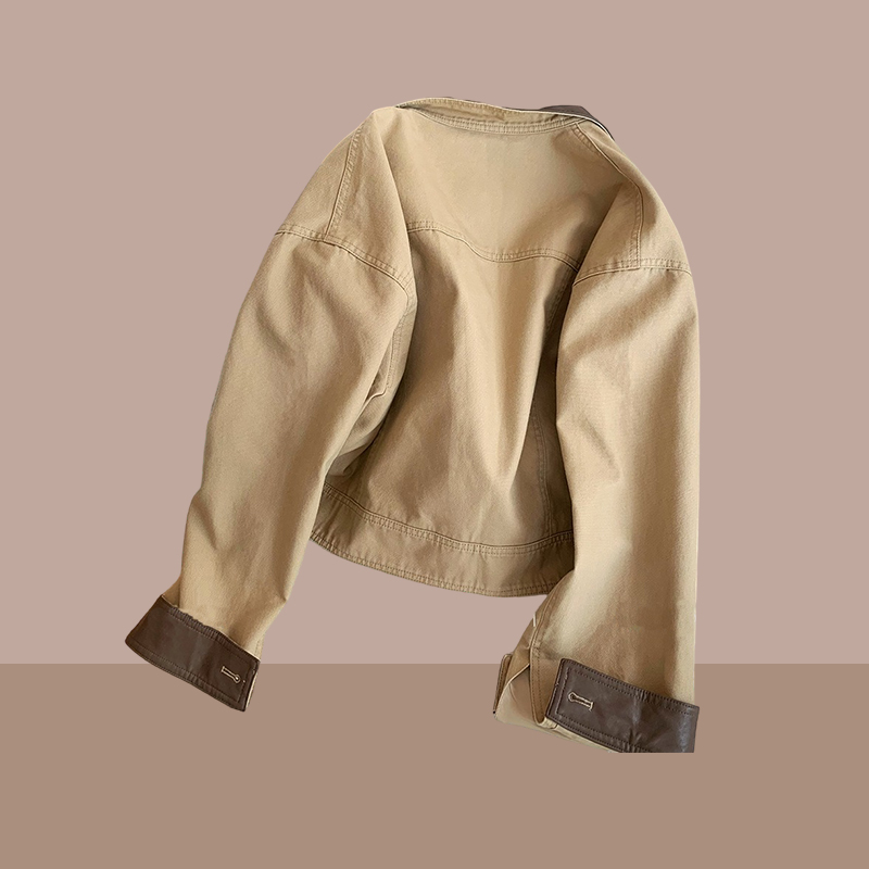 复古卡其色重工拼皮工装外套女2025秋季新款高级感机车服短款夹克