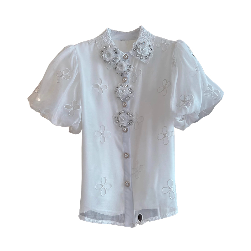 2025年夏季新款重工镶钻立体花朵泡泡袖衬衫女气质显瘦短袖雪纺衫