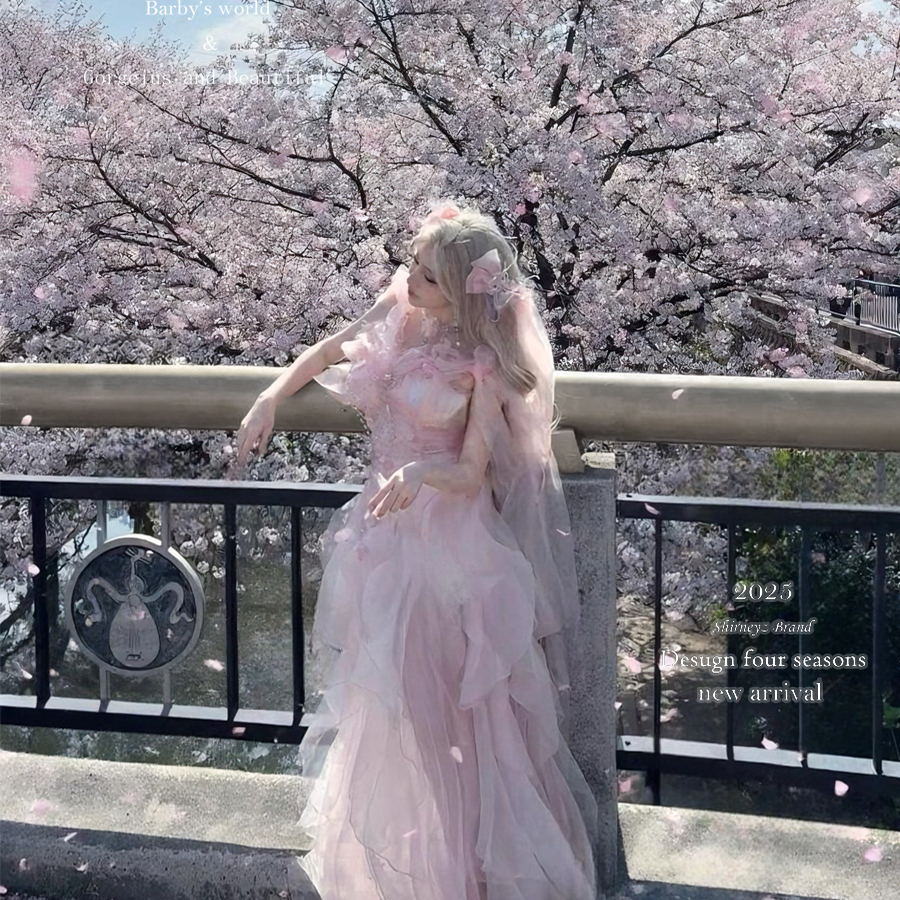 雪妮原创〈樱灵花姬〉粉色一字肩抹胸连衣裙浪漫法式仙女裙公主裙