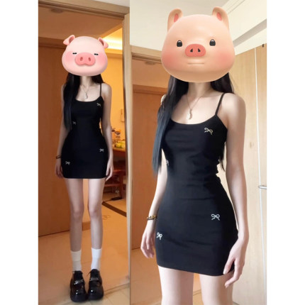 刺绣蝴蝶结吊带小黑裙女夏季修身