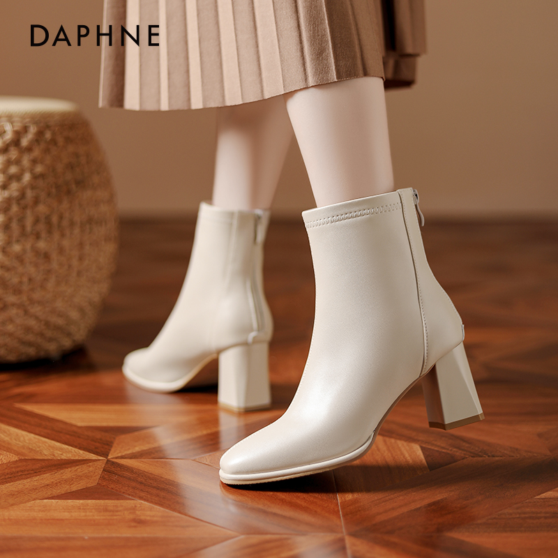 达芙妮白色短靴女2025新款靴子女马丁靴法式裸靴瘦瘦靴高跟鞋女冬