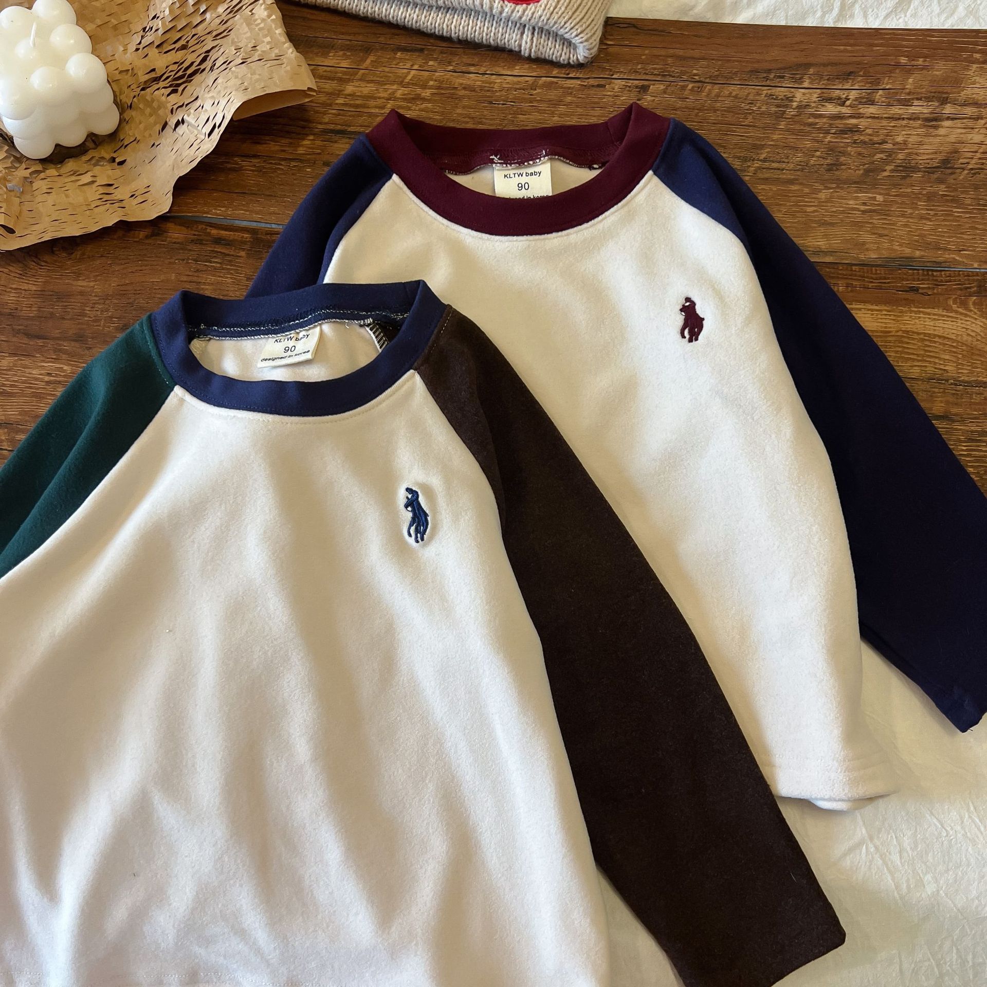 儿童弹力品质打底衫2025秋冬装男女童撞色插肩袖T恤加绒潮牌长袖
