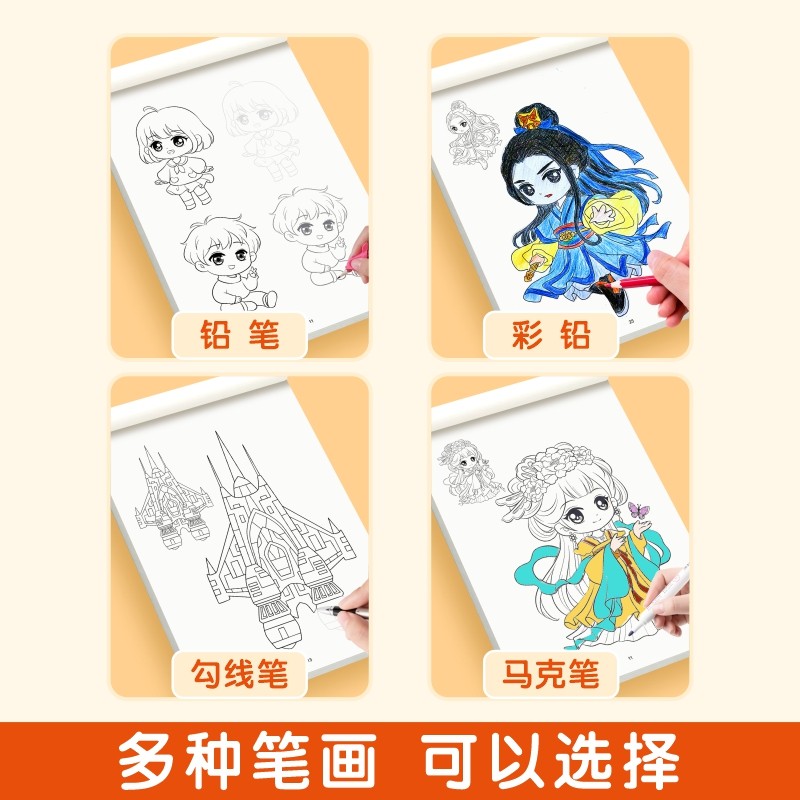 漫画入门手绘练习册描摹本填色画线稿儿童涂色书画册diy卡通简笔画幼儿艺术画画本绘画素材坦克战车美少女q版古风人物机甲勇士涂画
