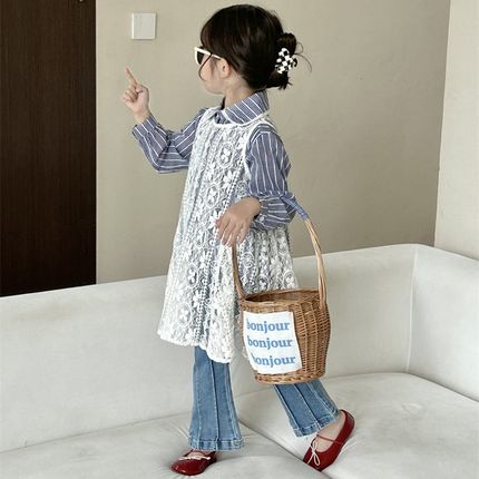 春季新款童装女童春装女宝宝衣服套装裤子简约蕾丝背心裙条纹衬衫