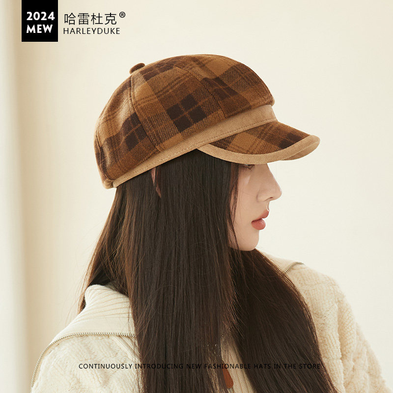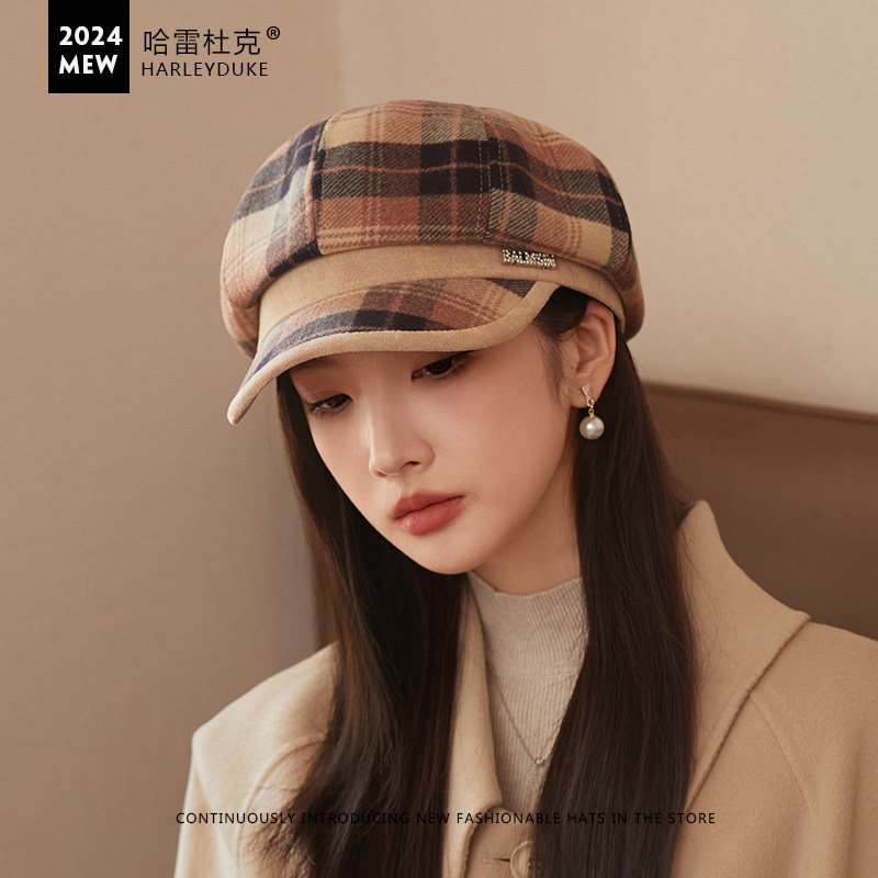 复古英伦风格子八角帽子女秋季新款韩版百搭显脸小气质画家报童帽