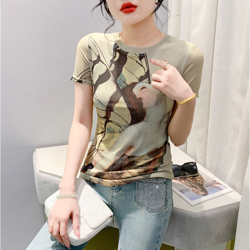 时尚潮流夏季雪纺印花圆领T恤女短袖修身百搭上衣网纱小衫体恤ins