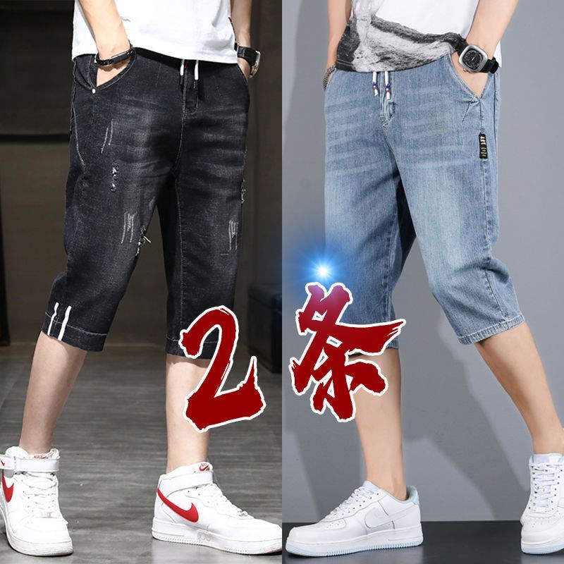 浅蓝牛仔短裤男士2024新款夏季青年宽松百搭松紧抽绳直筒七分裤子