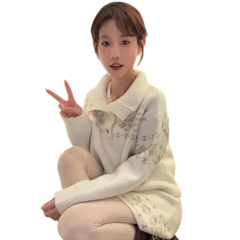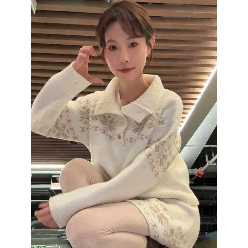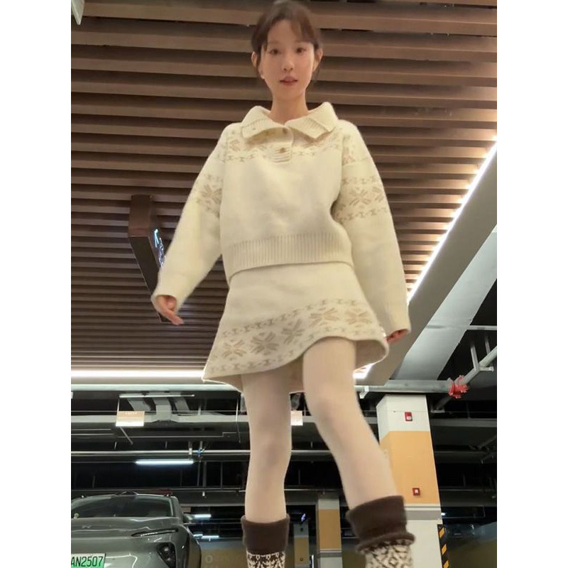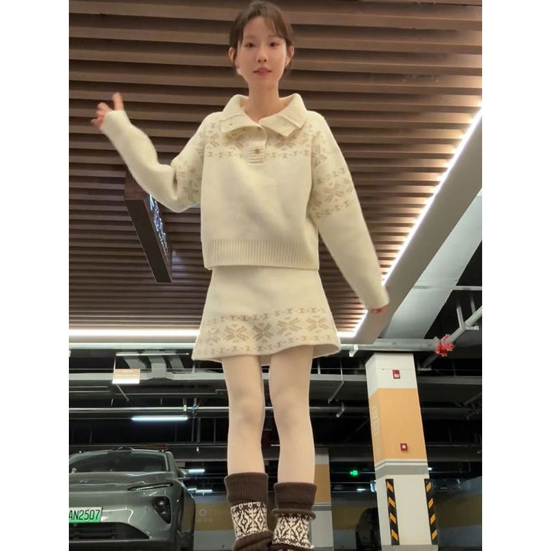 小众甜美风费尔岛雪花翻领针织套头毛衣女搭配针织半身裙两件套装