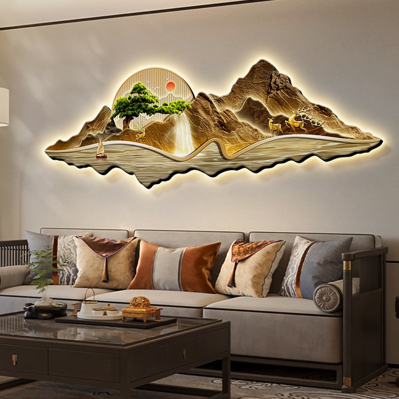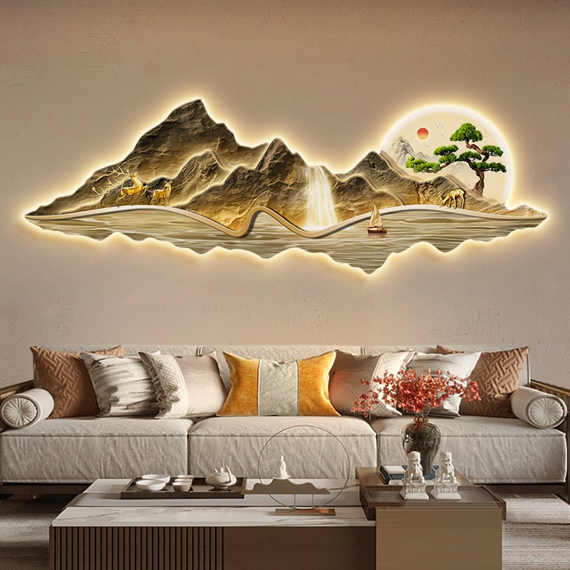 新中式客厅装饰画流水生财沙发背景墙挂画大气高档带灯发光山水画
