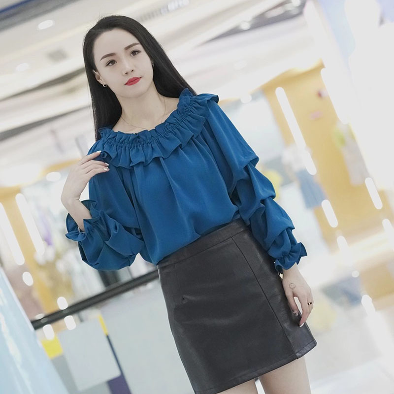 早春款荷叶领衬衫可甜可咸一字肩灯笼袖日系女神款雪纺衫打底上衣