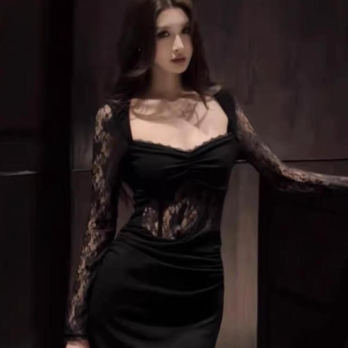 300斤法式性感蕾丝拼接收腰连衣裙胖mm气质显瘦御姐特大码包臀裙