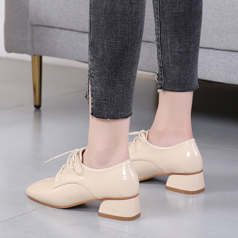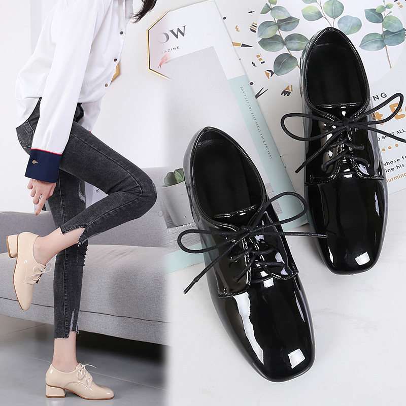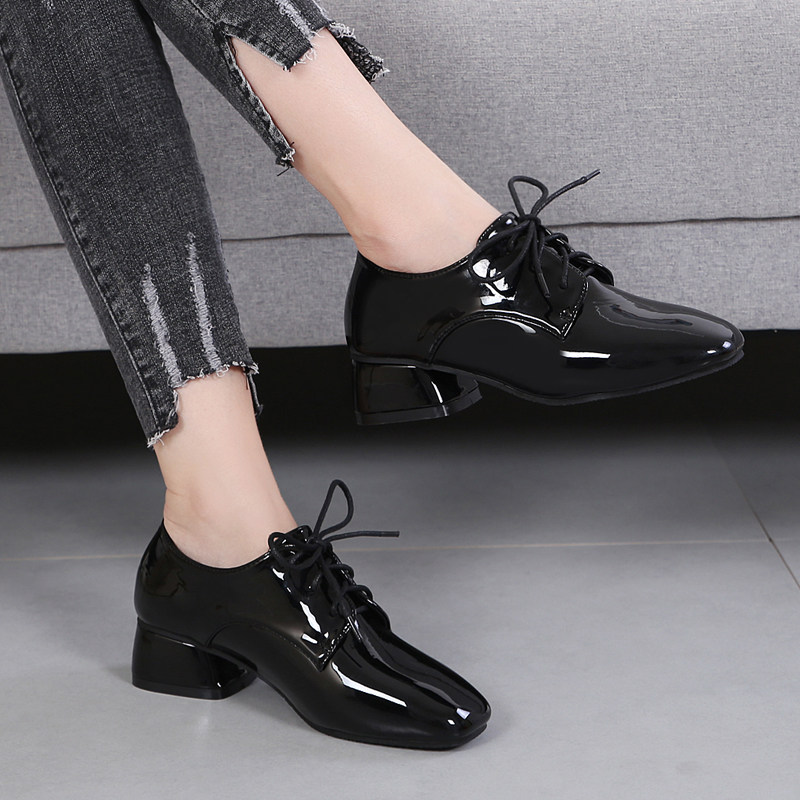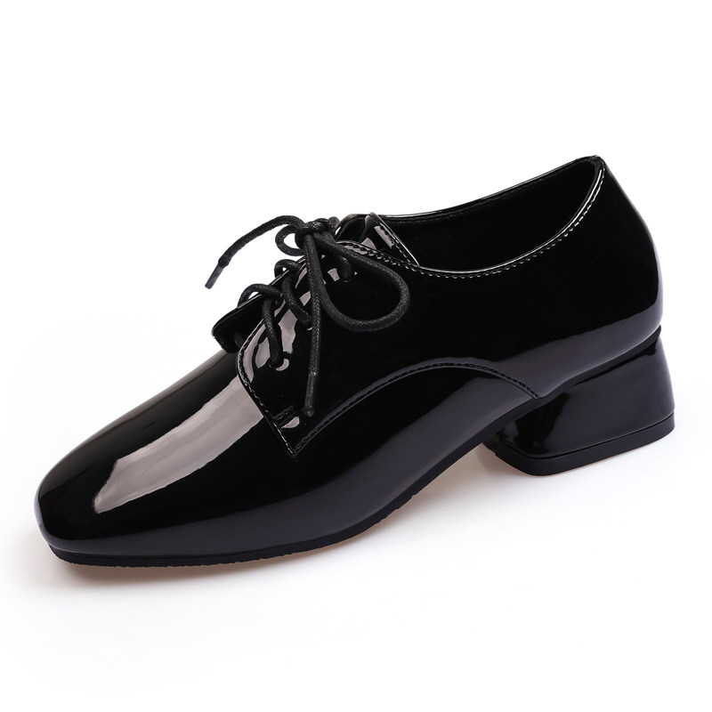 秋冬新款小码女鞋313233方头深口中粗跟系带漆皮小皮鞋女单鞋加绒