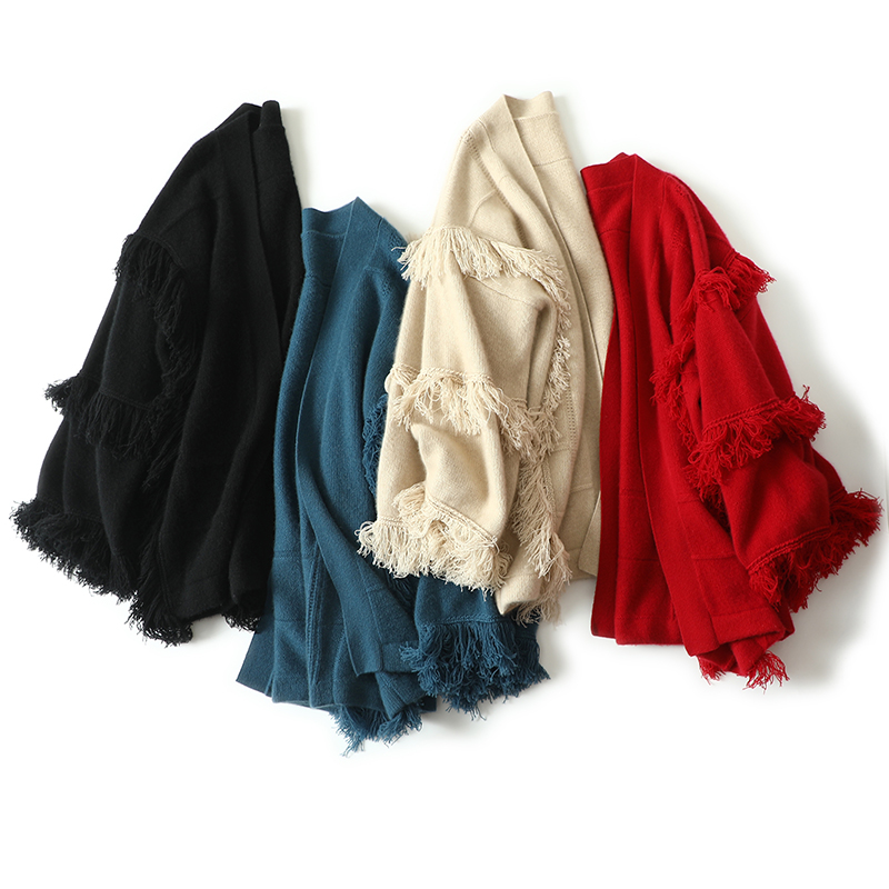 狂抬气质!大克重加厚流苏阔袖羊绒开衫女中长款纯羊绒毛衣外套冬