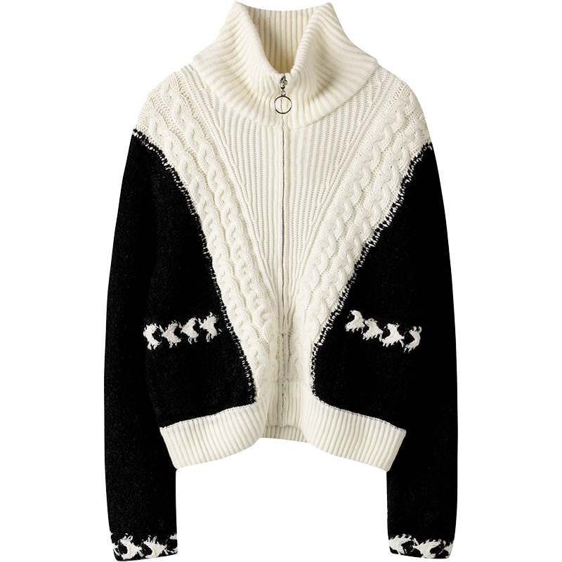 潮人都爱!!黑白拼色纯羊绒上衣冬厚款毛衣外套针织开衫女