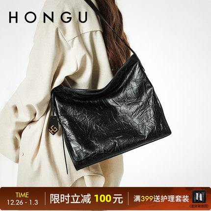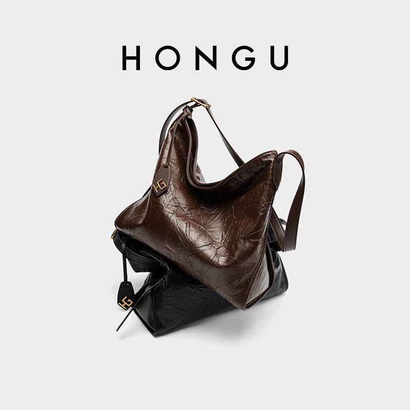 HONGU/红谷女士大容量托特包复古亮面单肩包包女时髦百搭纹理